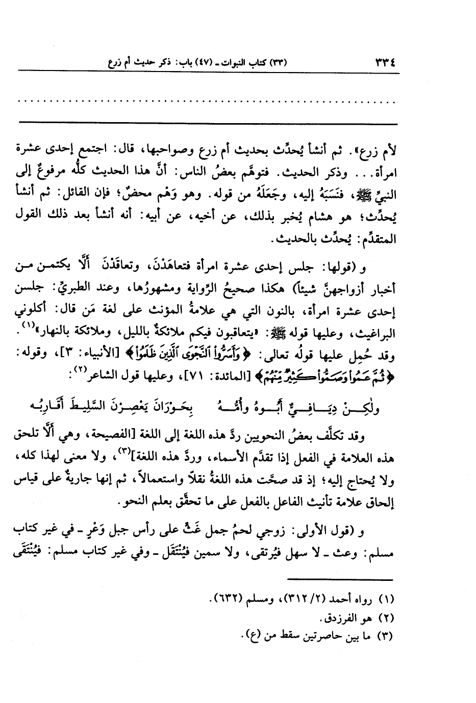 لأم زرع. ثم أنشأ يحدِّث بحديث أم زرع وصواحبها، قال: اجتمع إحدى عشرة امرأة. . . وذكر الحديث. فتوهم بعض الناس: أن هذا الحديث كلُّه مرفوعٌ إلى النبي ـ صلى الله عليه وسلم ـ، فنسبه إليه، وجعله من قوله. وهو وهم محض، فإنَّ القائل: ثم أنشأ يحدِّث، هو: هشام يخبر بذلك، عن أخيه، عن أبيه: أنه أنشأ بعد ذلك القول المتقدِّم: يحدَّث بالحديث.
