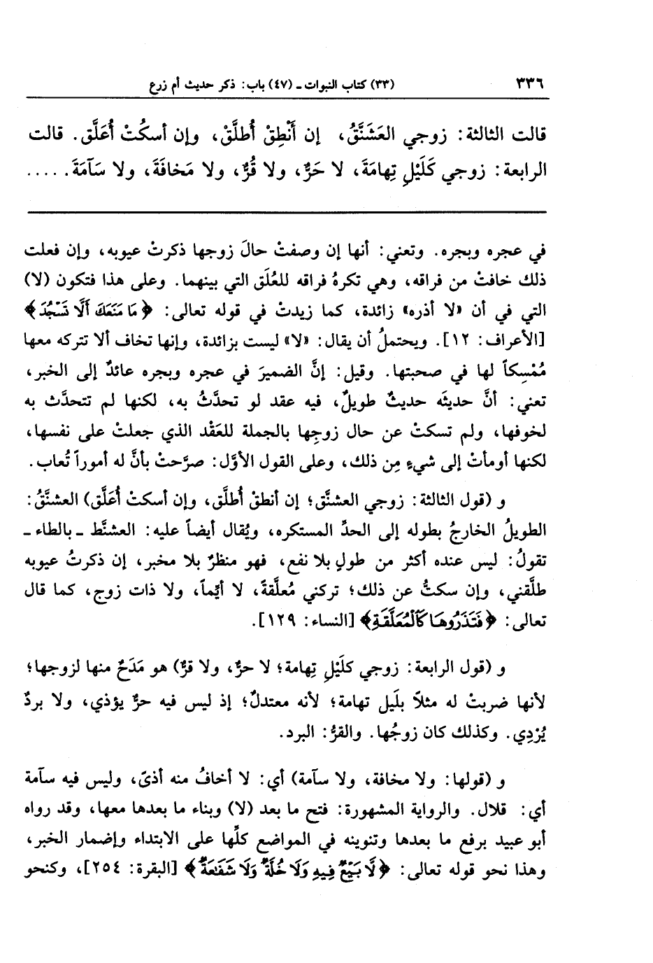 قَالَت الثَّالِثَةُ: زَوجِي العَشَنَّقُ إِن أَنطِق أُطَلَّق، وَإِن أَسكُت أُعَلَّق، قَالَت الرَّابِعَةُ: زَوجِي كَلَيلِ تِهَامَةَ، لَا حَرَّ وَلَا قُرَّ، وَلَا مَخَافَةَ وَلَا سَآمَةَ،