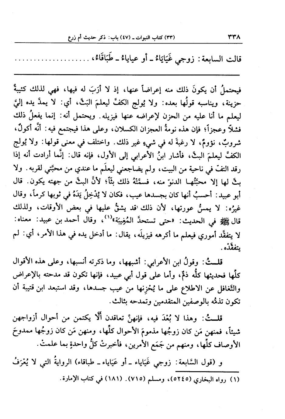 قلت: وقول ابن الأعرابي: أشبهها، وما ذكرته أنسبها، وعلى هذه الأقوال كلها فحديثها كله ذمٌّ، وأما على قول أبي عبيد، فإنَّها تكون قد مدحته بالإعراض والتغافل عن الاطلاع على ما يحزنها من عيب جسدها، وقد استبعد ابن قتيبة أن تكون تذمُّه بالوصفين المتقدِّمين وتمدحه بثالث.