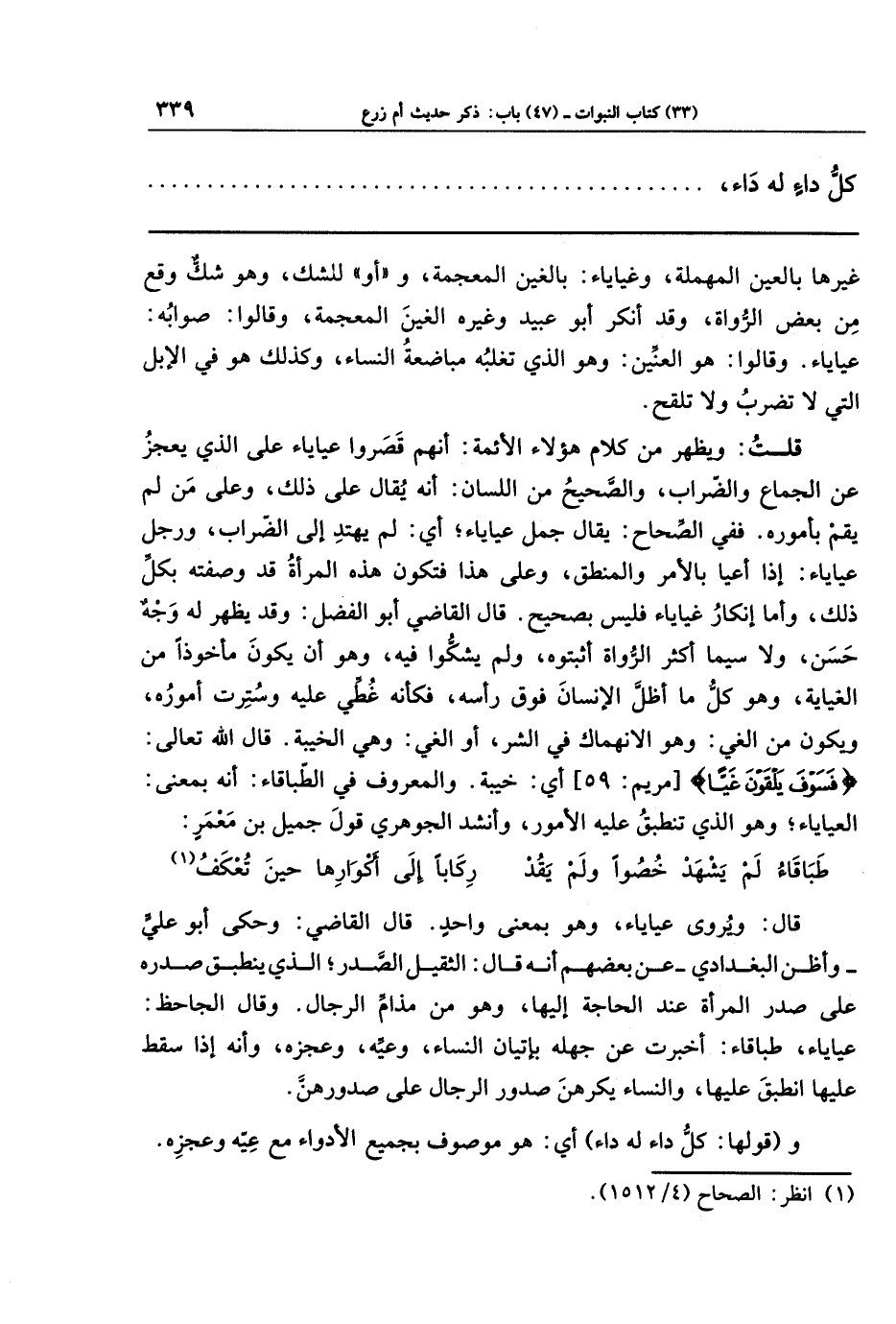 قلت: ويظهر من كلام هؤلاء الأئمة: أنهم قصروا عياياء على الذي يعجز عن الجماع والضِّراب، والصحيح من اللسان: أنه يقال على ذلك، وعلى من لم يقم بأموره. ففي الصحاح: يقال جمل عياياء، أي: لم يهتد إلى الضراب، ورجل عياياء: إذا أعَيا بالأمر والمنطق، وعلى هذا فتكون هذه المرأة قد وصفته بكل ذلك، وأما إنكار غياياء فليس بصحيح.