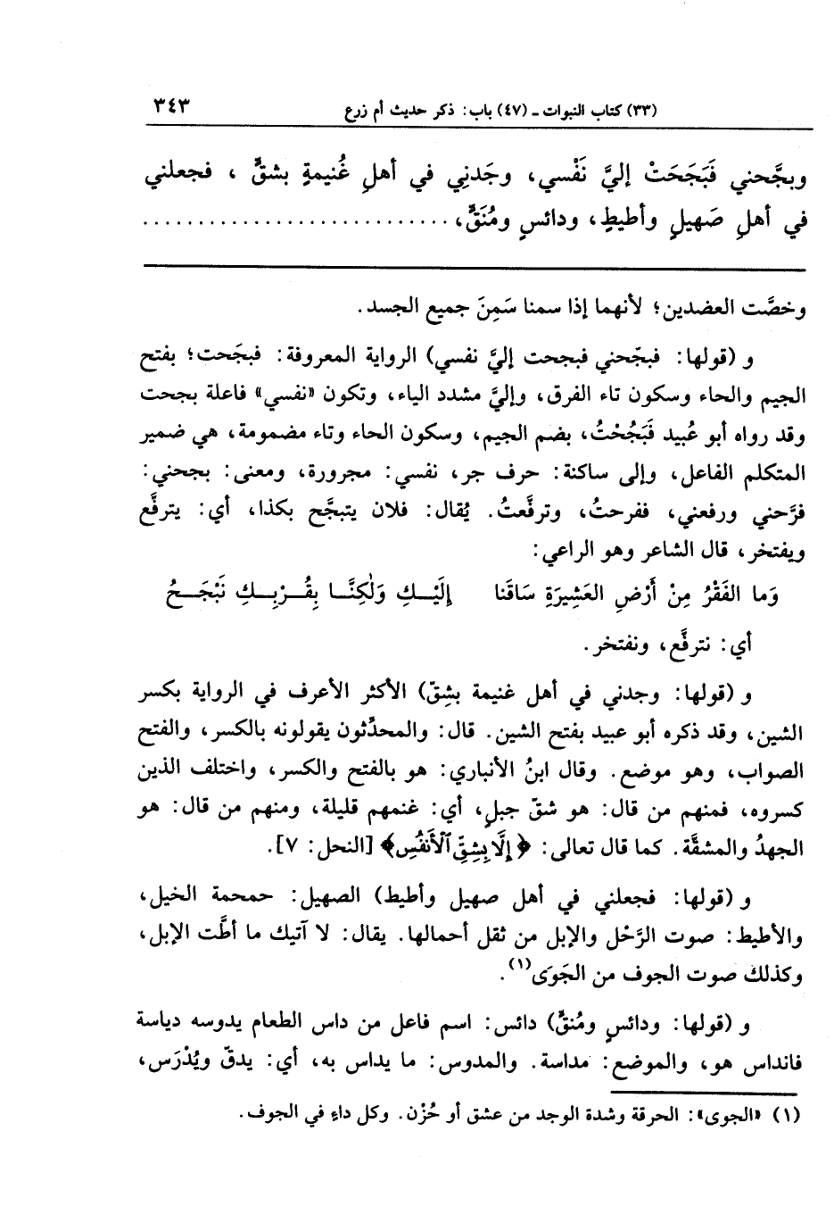 و(قولها: فبجَحني فبجحت إليَّ نفسي) الرواية المعروفة: فبَجَحَت بفتح الجيم والحاء وسكون تاء الفرق، وإلي مشدد الياء، وتكون نفسي فاعلة بجحت، وقد رواه أبو عبيد: فَبَجُحتُ بضم الجيم، وسكون الحاء وتاء مضمومة، هي ضمير المتكلم الفاعل، وإلى ساكنة: حرف جر، نفسي: مجرورة، ومعنى: بجحني: فرحني ورفعني، ففرحت، وترفعت. يقال: فلان يتبجَّح بكذا، أي: يترفع ويفتخر، قال الشاعر وهو الراعي: