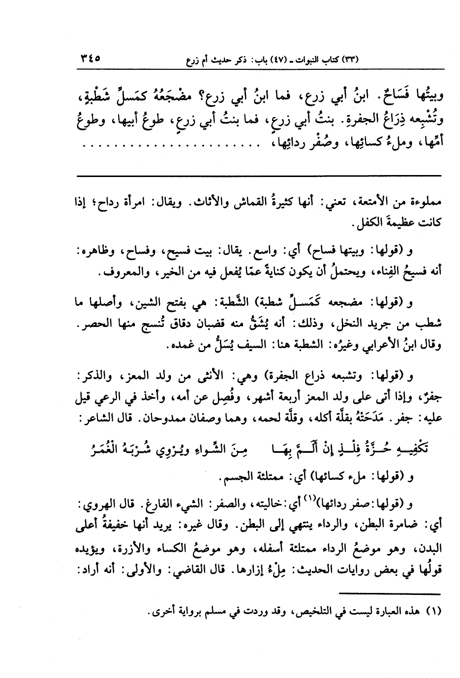 وَبَيتُهَا فَسَاحٌ، ابنُ أَبِي زَرعٍ، فَمَا ابنُ أَبِي زَرعٍ؟ مَضجَعُهُ كَمَسَلِّ شَطبَةٍ، وَتُشبِعُهُ ذِرَاعُ الجَفرَةِ، بِنتُ أَبِي زَرعٍ، فَمَا بِنتُ أَبِي زَرعٍ؟ طَوعُ أَبِيهَا، وَطَوعُ أُمِّهَا، وَمِلءُ كِسَائِهَا، وصفر ردائها،