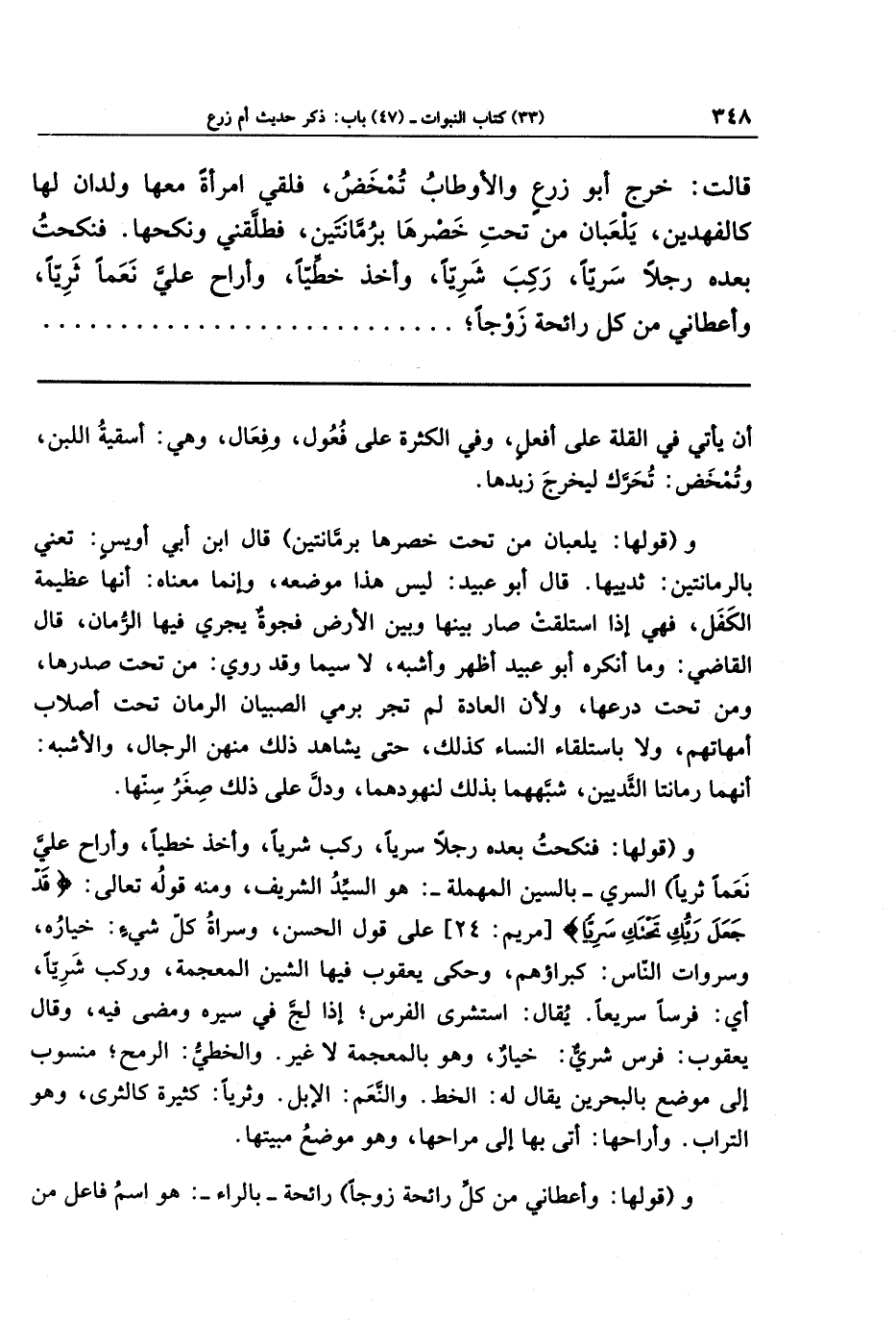 و(قولها: فنكحتُ بعده رجلًا سريًا، ركب شريًا، وأخذ خطيًا، وأراح عليَّ نَعَمًا ثريًا) السري - بالسين المهملة -: هو السيِّد الشريف، ومنه قوله تعالى: {قَد جَعَلَ رَبُّكِ تَحتَكِ سَرِيًّا} على قول الحسن، وسراة كل شيء: خياره، وسروات الناس: كبراؤهم، وحكى يعقوب فيها الشين المعجمة.