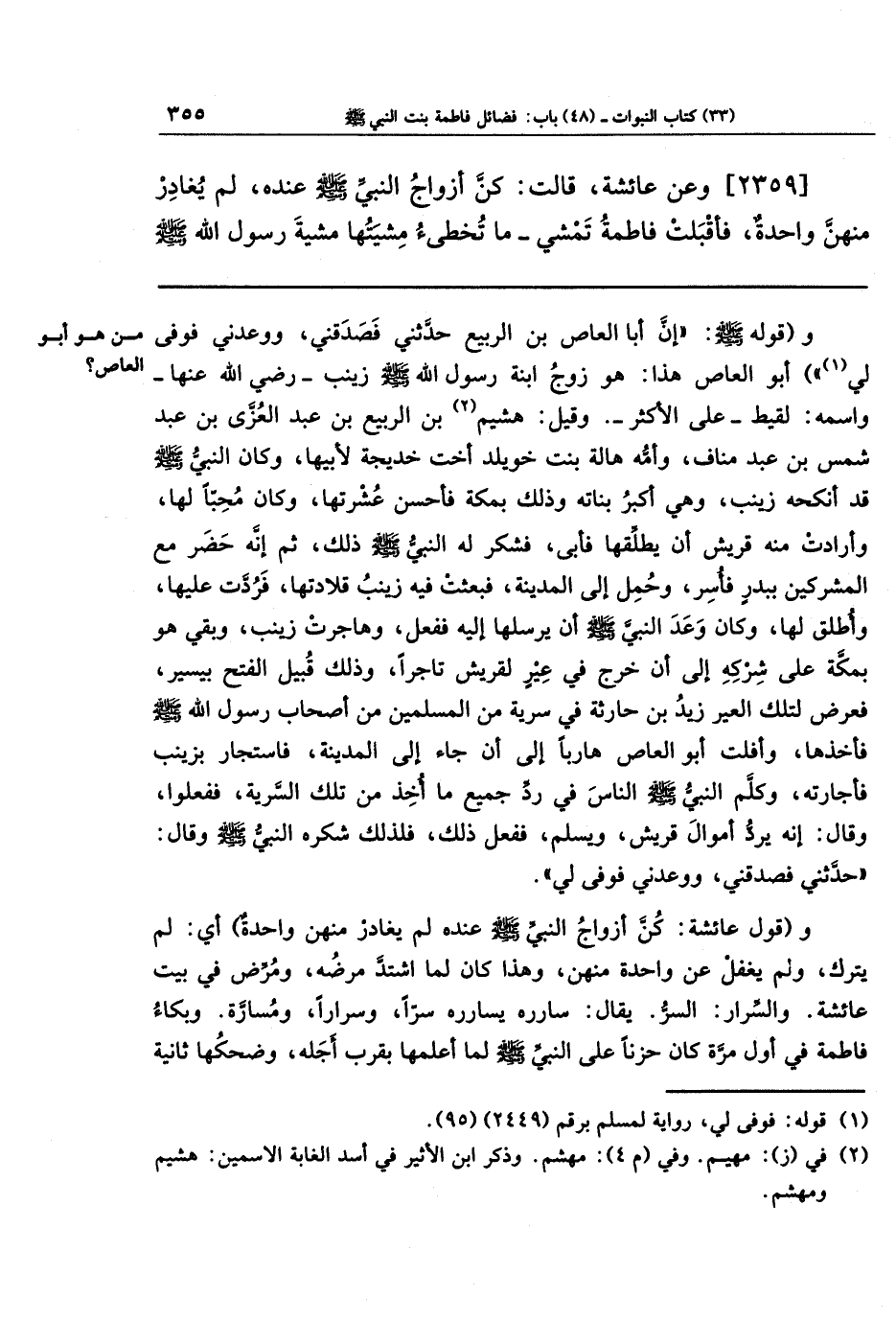 [2359] وعن عَائِشَةَ قَالَت: كُنَّ أَزوَاجُ النَّبِيِّ صَلَّى اللَّهُ عَلَيهِ وَسَلَّمَ عِندَهُ لَم يُغَادِر مِنهُنَّ وَاحِدَةً، فَأَقبَلَت فَاطِمَةُ تَمشِي مَا تُخطِئُ مِشيَتُهَا مِشيَة رَسُولِ اللَّهِ صَلَّى اللَّهُ عَلَيهِ وَسَلَّمَ