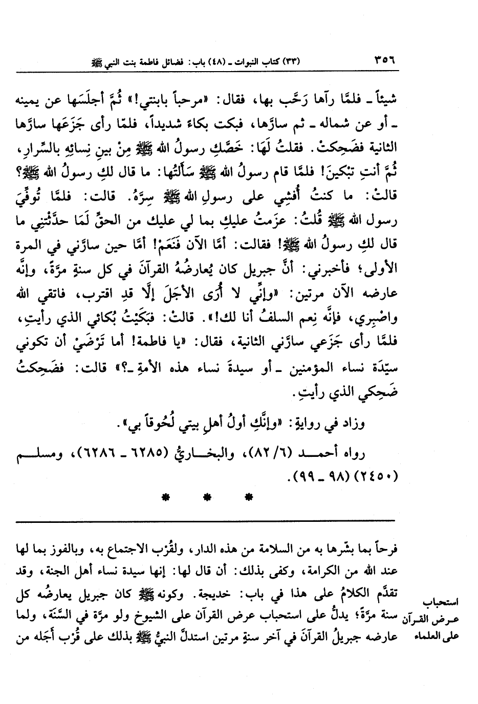 شَيئًا، فَلَمَّا رَآهَا رَحَّبَ بِهَا، فَقَالَ: مَرحَبًا بِابنَتِي، ثُمَّ أَجلَسَهَا عَن يَمِينِهِ - أَو عَن شِمَالِهِ - ثُمَّ سَارَّهَا، فَبَكَت بُكَاءً شَدِيدًا، فَلَمَّا رَأَى جَزَعَهَا سَارَّهَا الثَّانِيَةَ فَضَحِكَت، فَقُلتُ لَهَا: خَصَّكِ رَسُولُ اللَّهِ صَلَّى اللَّهُ عَلَيهِ وَسَلَّمَ مِن بَينِ نِسَائِهِ بِالسِّرَارِ، ثُمَّ أَنتِ تَبكِينَ، فَلَمَّا قَامَ رَسُولُ اللَّهِ صَلَّى اللَّهُ عَلَيهِ وَسَلَّمَ سَأَلتُهَا: مَا قَالَ لَكِ رَسُولُ اللَّهِ صَلَّى اللَّهُ عَلَيهِ وَسَلَّمَ؟ قَالَت: مَا كُنتُ أُفشِي عَلَى رَسُولِ اللَّهِ صَلَّى اللَّهُ عَلَيهِ وَسَلَّمَ سِرَّهُ. قَالَت: فَلَمَّا تُوُفِّيَ رَسُولُ اللَّهِ صَلَّى اللَّهُ عَلَيهِ وَسَلَّمَ قُلتُ: عَزَمتُ عَلَيكِ بِمَا لِي عَلَيكِ مِن الحَقِّ لَمَا حَدَّثتِنِي مَا قَالَ لَكِ رَسُولُ اللَّهِ صَلَّى اللَّهُ عَلَيهِ وَسَلَّمَ، فَقَالَت: أَمَّا الآنَ فَنَعَم، أَمَّا حِينَ سَارَّنِي فِي المَرَّةِ الأُولَى فَأَخبَرَنِي أَنَّ جِبرِيلَ كَانَ يُعَارِضُهُ القُرآنَ فِي كُلِّ سَنَةٍ مَرَّةً، وَإِنَّهُ عَارَضَهُ الآنَ مَرَّتَينِ، وَإِنِّي لَا أُرَى الأَجَلَ إِلَّا قَد اقتَرَبَ، فَاتَّقِي اللَّهَ وَاصبِرِي، فَإِنَّهُ نِعمَ السَّلَفُ أَنَا لَكِ، قَالَت: فَبَكَيتُ بُكَائِي الَّذِي رَأَيتِ، فَلَمَّا رَأَى جَزَعِي سَارَّنِي الثَّانِيَةَ فَقَالَ: يَا فَاطِمَةُ أَمَا تَرضَي أَن تَكُونِي سَيِّدَةَ نِسَاءِ المُؤمِنِينَ - أَو سَيِّدَةَ نِسَاءِ هَذِهِ الأُمَّةِ -؟ قَالَت: فَضَحِكتُ ضَحِكِي الَّذِي رَأَيتِ.