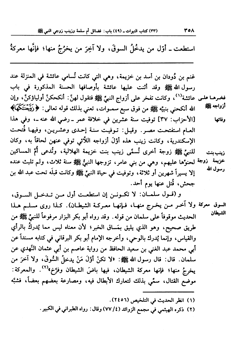 و(قول سلمان: لا تكونن إن استطعت أول من تدخل السوق، ولا آخر من يخرج منها، فإنَّها معركة الشيطان). كذا روى مسلم هذا الحديث موقوفًا على سلمان من قوله. وقد رواه أبو بكر البزار مرفوعًا للنبي ـ صلى الله عليه وسلم ـ من طريق صحيح، وهو الذي يليق بمساق الخبر، لأنَّ معناه ليس مما يدرك بالرأي والقياس، وإنما يدرك بالوحي، وأخرجه الإمام أبو بكر البرقاني في كتابه مسندًا عن أبي محمد عبد الغني بن سعيد الحافظ من رواية عاصم بن أبي عثمان النَّهدي عن سلمان. قال: قال رسول الله ـ صلى الله عليه وسلم ـ: لا تكن أوَّل من يدخل السوق، ولا آخر من يخرج منها، فإنَّها معركة الشيطان، فيها باض الشيطان وفرَّخ (¬2). والمعركة: موضع القتال، سُمِّي بذلك لتعارك الأبطال فيه، ومصارعة بعضهم بعضا، فشبه