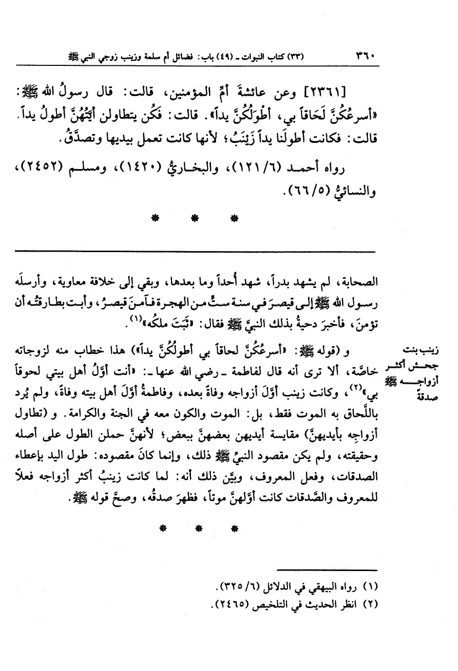 [2361] وعن عَائِشَةَ أُمِّ المُؤمِنِينَ قَالَت: قَالَ رَسُولُ اللَّهِ صَلَّى اللَّهُ عَلَيهِ وَسَلَّمَ: أَسرَعُكُنَّ لَحَاقًا بِي أَطوَلُكُنَّ يَدًا، قَالَت: فَكُنَّ يَتَطَاوَلنَ أَيَّتُهُنَّ أَطوَلُ يَدًا. قَالَت: فَكَانَت أَطوَلَنَا يَدًا زَينَبُ؛ لِأَنَّهَا كَانَت تَعمَلُ بِيَدِيهَا، وَتَصَدَّقُ.