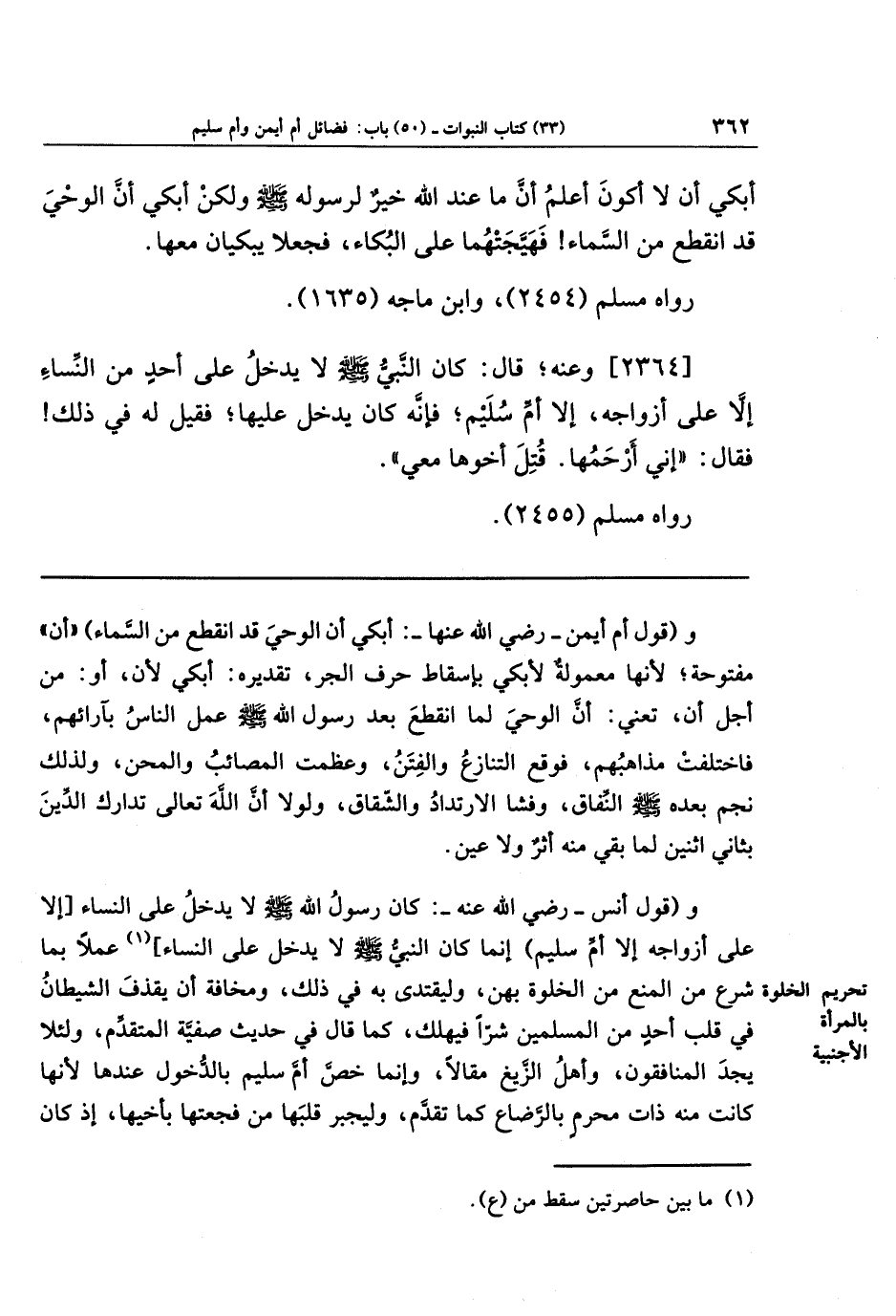 [2364] وعنه قَالَ: كَانَ النَّبِيُّ صَلَّى اللَّهُ عَلَيهِ وَسَلَّمَ لَا يَدخُلُ عَلَى أَحَدٍ مِن النِّسَاءِ إِلَّا عَلَى أَزوَاجِهِ إِلَّا أُمِّ سُلَيمٍ، فَإِنَّهُ كَانَ يَدخُلُ عَلَيهَا، فَقِيلَ لَهُ فِي ذَلِكَ فَقَالَ: إِنِّي أَرحَمُهَا، قُتِلَ أَخُوهَا مَعِي.