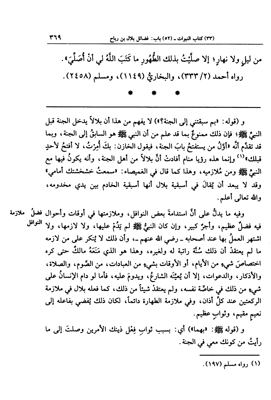 وفيه ما يدلّ على أن استدامة بعض النوافل، وملازمتها في أوقات وأحوال فيه فضل عظيم، وأجر كبير، وإن كان النبي ـ صلى الله عليه وسلم ـ لم يدم عليها، ولا لازمها، ولا اشتهر العمل بها عند أصحابه ـ رضي الله عنهم ـ، وأن ذلك لا ينكر على من لازمه ما لم يعتقد أن ذلك سنة راتبة له ولغيره، وهذا هو الذي منعه مالك حتى كره اختصاص شيء من الأيام، أو الأوقات بشيء من العبادات، من الصوم، والصلاة، والأذكار، والدعوات، إلا أن يعينه الشارع، ويدوم عليه، فأمَّا لو دام الإنسان على شيء من ذلك في خاصة نفسه، ولم يعتقد شيئًا من ذلك، كما فعله بلال في ملازمة الركعتين عند كل أذان، وفي ملازمة الطهارة دائمًا، لكان ذلك يفضي بفاعله إلى نعيم مقيم، وثواب عظيم.