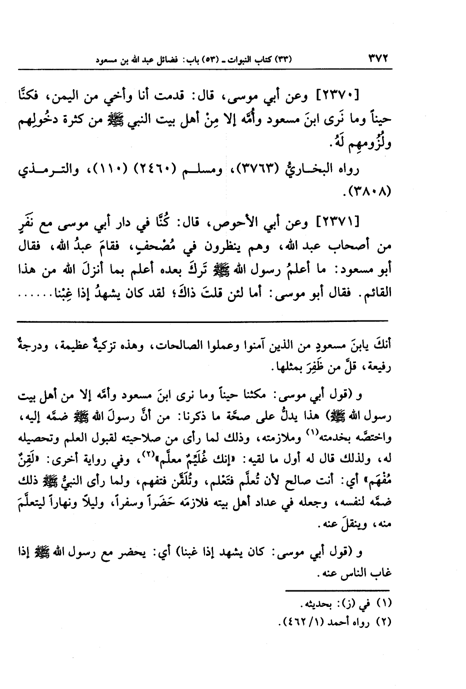 [2370] وعن أبي موسى قال: قَدِمتُ أَنَا وَأَخِي مِن اليَمَنِ فَكُنَّا حِينًا وَمَا نُرَى ابنَ مَسعُودٍ وَأُمَّهُ إِلَّا مِن أَهلِ بَيتِ النبي صَلَّى اللَّهُ عَلَيهِ وَسَلَّمَ مِن كَثرَةِ دُخُولِهِم وَلُزُومِهِم لَهُ.
