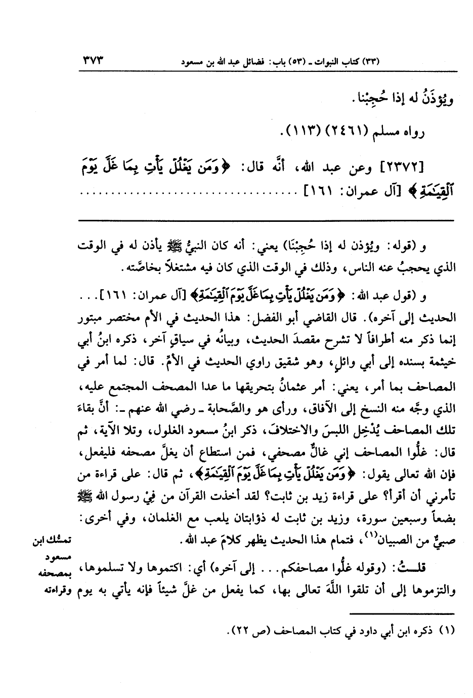 و(قول عبد الله: {وَمَن يَغلُل يَأتِ بِمَا غَلَّ يَومَ القِيَامَةِ} الحديث إلى آخره). قال القاضي أبو الفضل: هذا الحديث في الأم مختصر مبتور، إنما ذكر منه أطرافًا لا تشرح مقصد الحديث، وبيانه في سياق آخر، ذكره ابن أبي خيثمة بسنده إلى أبي وائل، وهو شقيق راوي الحديث في الأم، قال: لما أمر في المصاحف بما أمر، يعني: أمر عثمان بتحريقها ما عدا المصحف المجتمع عليه، الذي وجَّه منه النسخ إلى الآفاق، ورأى هو والصحابة ـ رضي الله عنهم ـ: أن بقاء تلك المصاحف يدخل اللبس والاختلاف، ذكر ابن مسعود الغلول، وتلا الآية، ثم قال: غلُّوا المصاحف إني غالٌّ مصحفي، فمن استطاع أن يَغلَّ مصحفه فليفعل، فإنَّ الله تعالى يقول: {وَمَن يَغلُل يَأتِ بِمَا غَلَّ يَومَ القِيَامَةِ} ثم قال: على قراءة من تأمرني أن أقرأ؟ على قراءة زيد بن ثابت؟ لقد أخذت القرآن من في رسول الله ـ صلى الله عليه وسلم ـ بضعًا وسبعين سورة، وزيد بن ثابت له ذؤابتان يلعب مع الغلمان، وفي أخرى: صبي من الصبيان (¬1)، فتمام هذا الحديث يظهر كلام عبد الله.