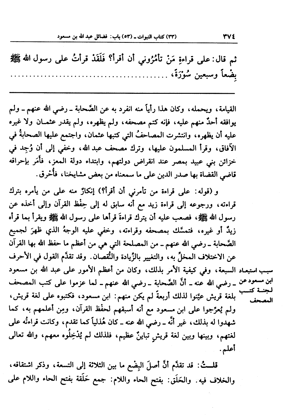 القيامة، ويحمله، وكان هذا رأيًا منه انفرد به عن الصحابة ـ رضي الله عنهم ـ ولم يوافقه أحد منهم عليه، فإنَّه كتم مصحفه، ولم يظهره، ولم يقدر عثمان ولا غيره عليه أن يظهره، وانتشرت المصاحف التي كتبها عثمان، واجتمع عليها الصحابة في الآفاق، وقرأ المسلمون عليها، وترك مصحف عبد الله، وخفي إلى أن وجد في خزائن بني عبيد بمصر عند انقراض دولتهم، وابتداء دولة المعز، فأمر بإحراقه قاضي القضاة بها صدر الدين، على ما سمعناه من بعض مشايخنا، فأحرق.
