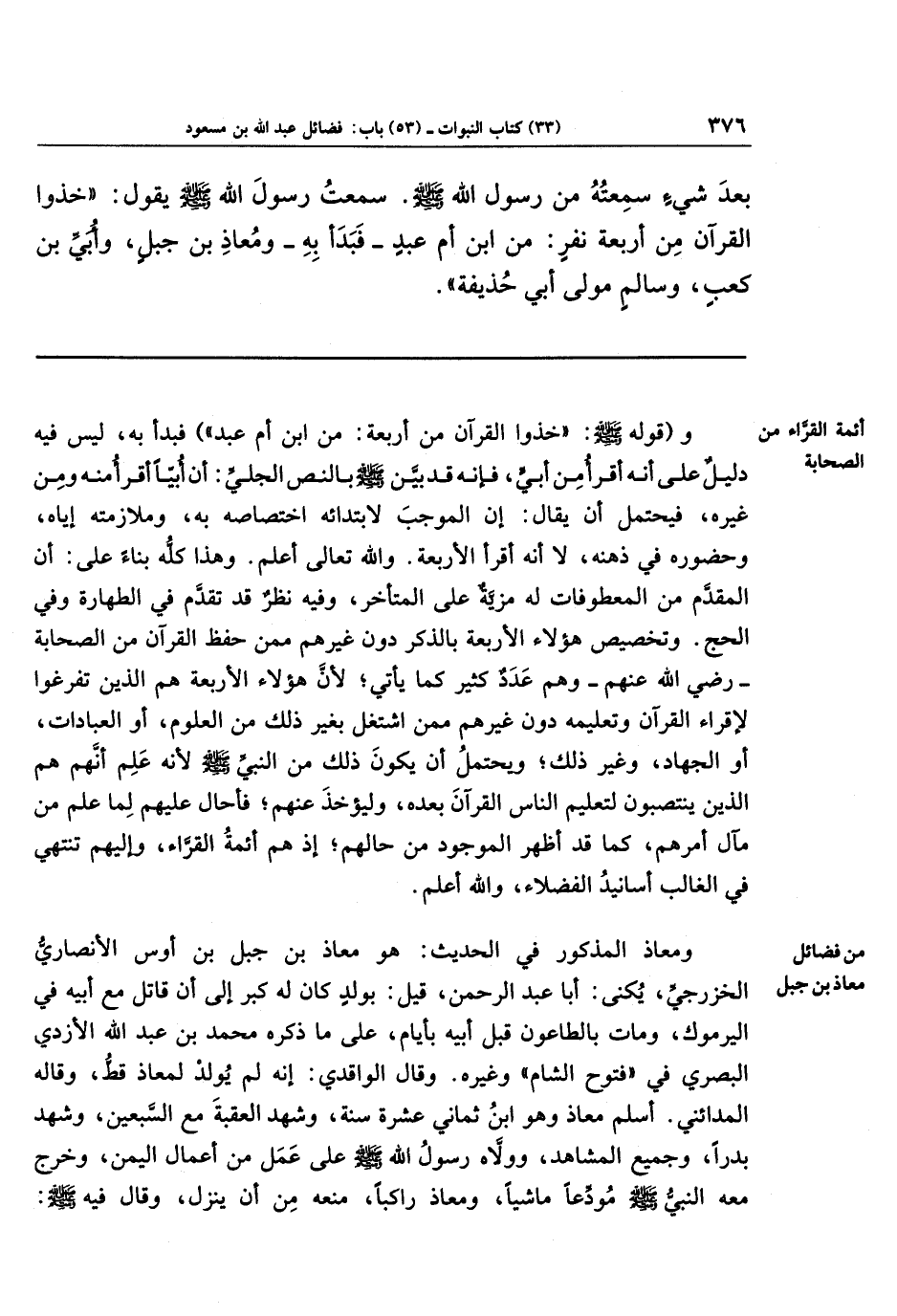 بَعدَ شَيءٍ سَمِعتُهُ مِن رَسُولِ اللَّهِ صَلَّى اللَّهُ عَلَيهِ وَسَلَّمَ، سَمِعتُ رَسُولَ اللَّهِ صَلَّى اللَّهُ عَلَيهِ وَسَلَّمَ يَقُولُ: خُذُوا القُرآنَ مِن أَربَعَة نفر: مِن ابنِ أُمِّ عَبدٍ - فَبَدَأَ بِهِ - وَمُعَاذِ بنِ جَبَلٍ، وَأُبَيِّ بنِ كَعبٍ، وَسَالِمٍ مَولَى أَبِي حُذَيفَةَ.