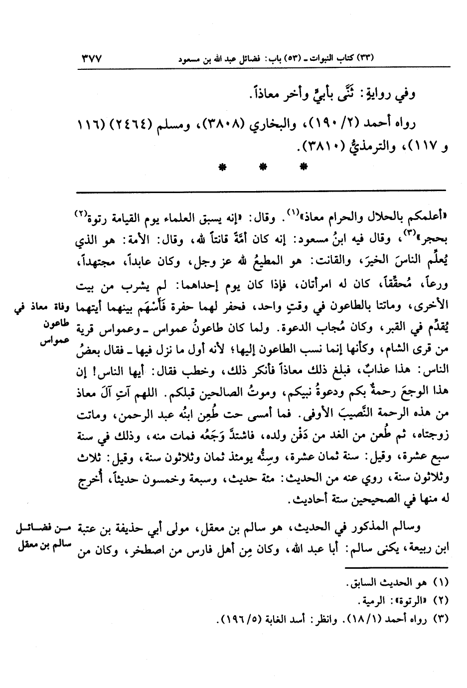 أعلمكم بالحلال والحرام معاذ (¬1). وقال: إنه يسبق العلماء يوم القيامة رتوة (¬2) بحجر (¬3)، وقال فيه ابن مسعود: إنه كان أمة قانتًا لله، وقال: الأمة: هو الذي يعلم الناس الخير، والقانت: هو المطيع لله عز وجل، وكان عابدًا، مجتهدًا، وَرِعًا، محققًا، كان له امرأتان، فإذا كان يوم إحداهما: لم يشرب من بيت الأخرى، وماتتا بالطاعون في وقت واحد، فحفر لهما حفرة فأسهم بينهما أيتهما يُقدَّم في القبر، وكان مجاب الدعوة، ولما كان طاعون عمواس - وعمواس قرية من قرى الشام، وكأنها إنما نسب الطاعون إليها، لأنَّه أول ما نزل فيها - فقال بعض الناس: هذا عذابٌ، فبلغ ذلك معاذًا فأنكر ذلك، وخطب فقال: أيها الناس! إن هذا الوجع رحمةُ بكم ودعوة نبيكم، وموت الصالحين قبلكم. اللهم آت آل معاذ من هذه الرحمة النصيب الأوفى. فما أمسى حتى طُعِن ابنه عبد الرحمن، وماتت زوجتاه، ثم طُعِن من الغد من دفن ولده، فاشتد وجعه فمات منه، وذلك في سنة سبع عشرة، وقيل: سنة ثمان عشرة، وسنُّه يومئذ ثمان وثلاثون سنة، وقيل: ثلاث وثلاثون سنة، روي عنه من الحديث: مائة حديث، وسبعة وخمسون حديثًا، أخرج له منها في الصحيحين ستة أحاديث.