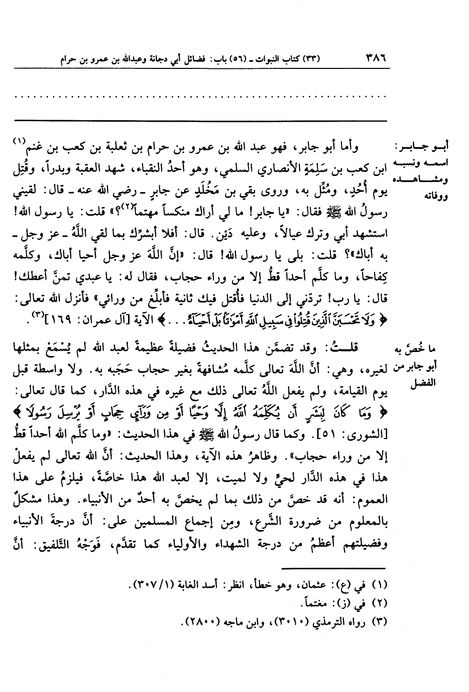 وروى بقي بن مَخلَد عن جابر ـ رضي الله عنه ـ قال: لقيني رسول الله ـ صلى الله عليه وسلم ـ فقال: يا جابر، ما لي أراك منكسًا مهتمًا (¬2)؟ ، قلت: يا رسول الله، استشهد أبي وترك عيالًا، وعليه دين! قال: أفلا أبشرك بما لقي الله عز وجل به أباك؟ ، قلت: بلى يا رسول الله! قال: إن الله عز وجل أحيا أباك وكلمه كفاحًا، وما كلَّم أحدًا قط إلا من وراء حجاب، فقال له: يا عبدي، تَمَنَّ أعطك! قال: يا رب، تردّني إلى الدنيا فأُقتل فيك ثانية فأبلِّغ من ورائي، فأنزل الله تعالى: {وَلا تَحسَبَنَّ الَّذِينَ قُتِلُوا فِي سَبِيلِ اللَّهِ أَموَاتًا بَل أَحيَاءٌ} الآية (¬3).