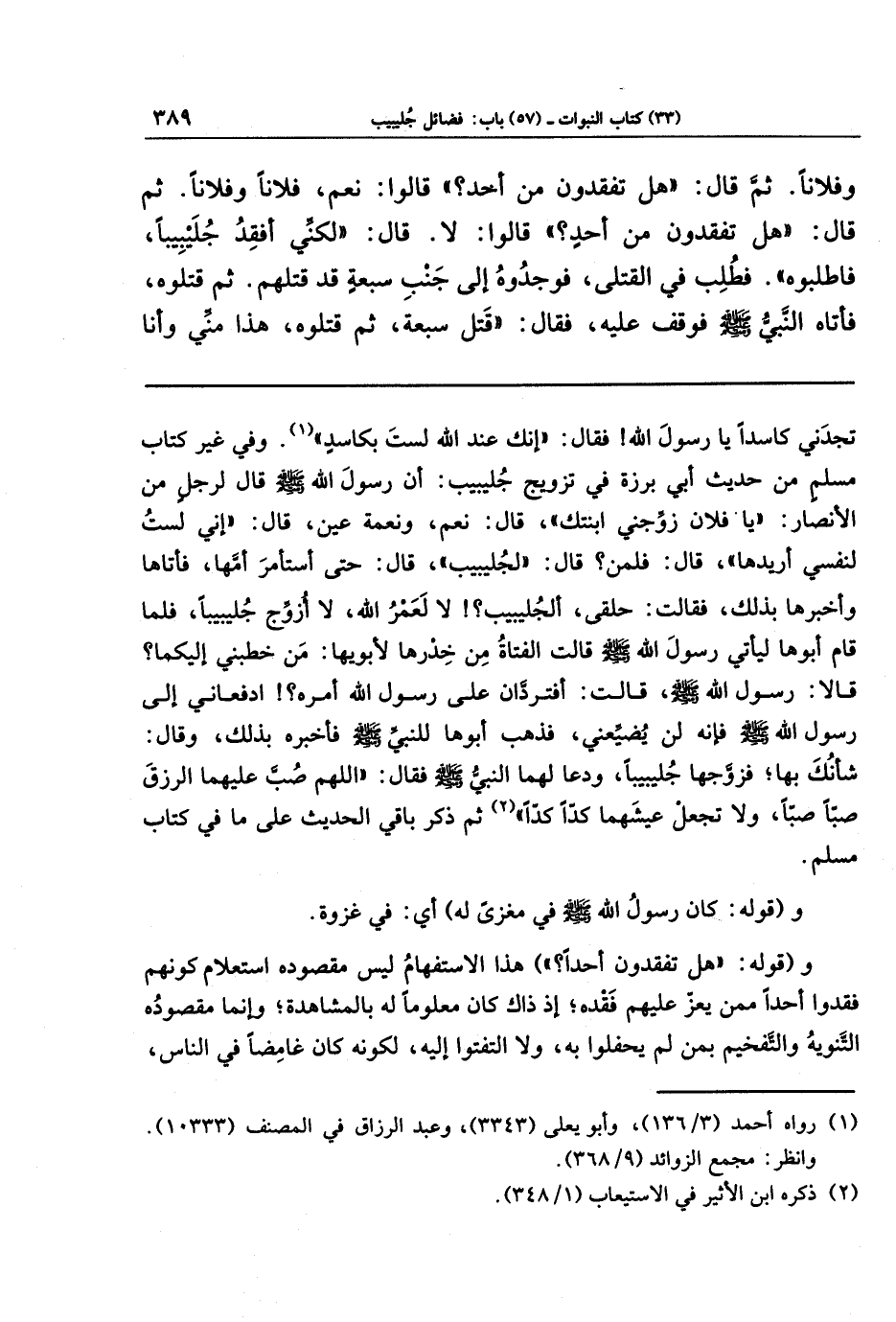 ثُمَّ قَالَ: هَل تَفقِدُونَ مِن أَحَدٍ؟ قَالُوا: لَا. قَالَ: لَكِنِّي أَفقِدُ جُلَيبِيبًا، فَاطلُبُوهُ! فَطُلِبَ فِي القَتلَى فَوَجَدُوهُ إِلَى جَنبِ سَبعَةٍ قَد قَتَلَهُم ثُمَّ قَتَلُوهُ، فَأَتَاه النَّبِيُّ صَلَّى اللَّهُ عَلَيهِ وَسَلَّمَ فَوَقَفَ عَلَيهِ فَقَالَ: قَتَلَ سَبعَةً ثُمَّ قَتَلُوهُ، هَذَا مِنِّي وَأَنَا