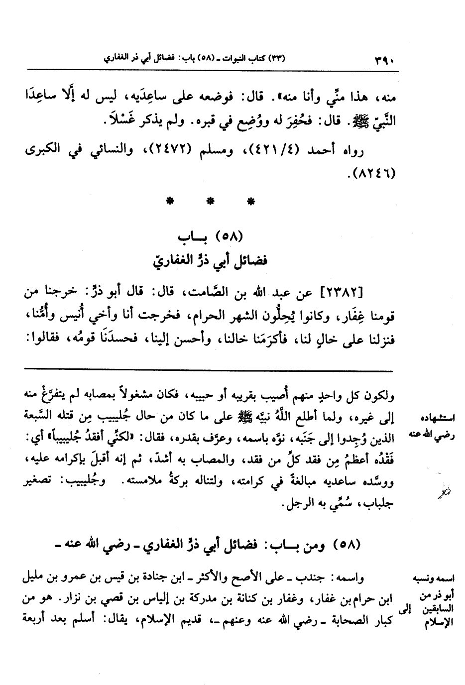 [2382] عَن عَبدِ اللَّهِ بنِ الصَّامِتِ قَالَ: قَالَ أَبُو ذَرٍّ: خَرَجنَا مِن قَومِنَا غِفَارٍ، وَكَانُوا يُحِلُّونَ الشَّهرَ الحَرَامَ، فَخَرَجتُ أَنَا وَأَخِي أُنَيسٌ وَأُمُّنَا، فَنَزَلنَا عَلَى خَالٍ لَنَا فَأَكرَمَنَا خَالُنَا وَأَحسَنَ إِلَينَا، فَحَسَدَنَا قَومُهُ فَقَالُوا: