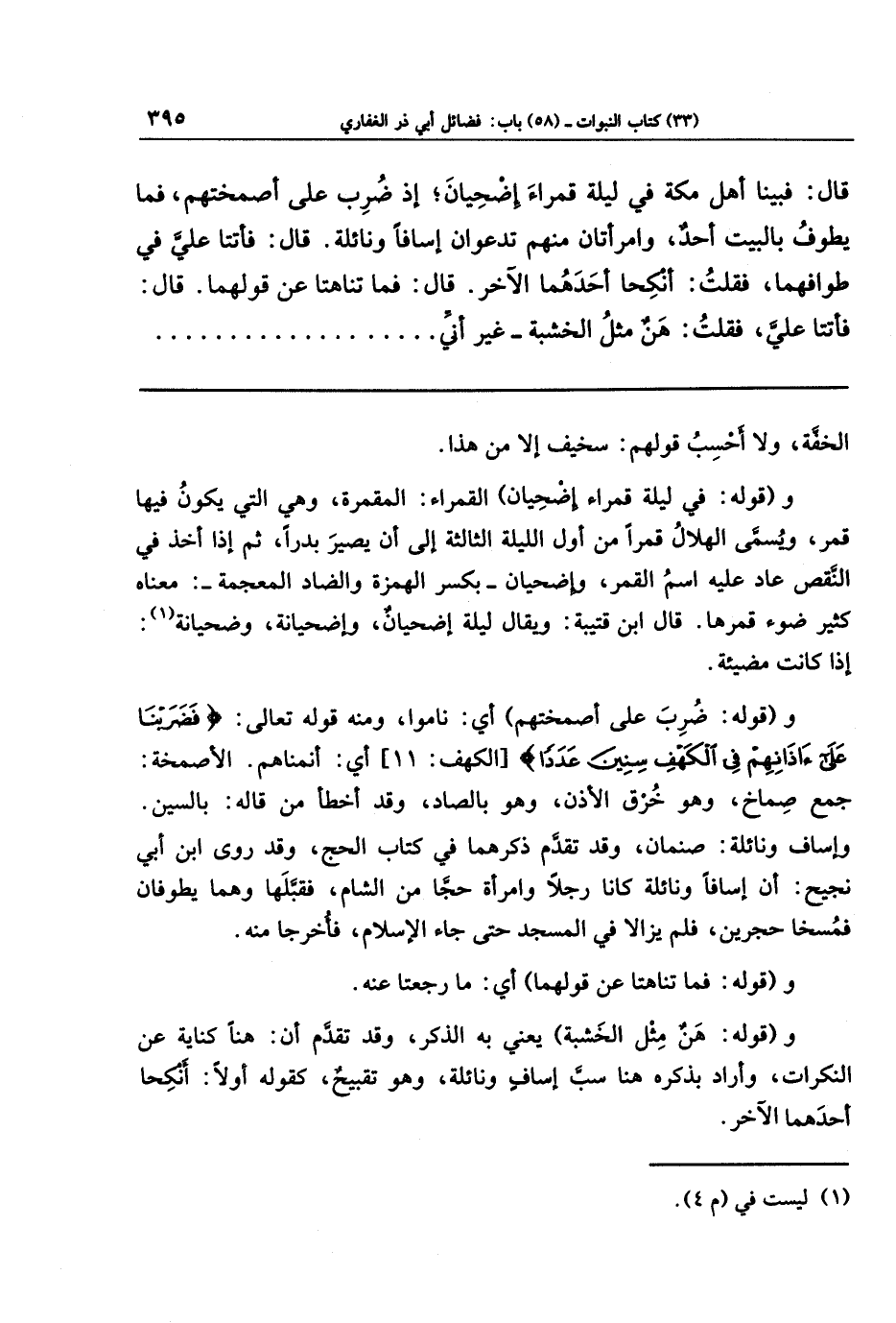 قَالَ: فَبَينَا أَهلِ مَكَّةَ فِي لَيلَةٍ قَمرَاءَ إِضحِيَانَ إِذ ضُرِبَ عَلَى أَصمِخَتِهِم فَمَا يَطُوفُ بِالبَيتِ أَحَدٌ، وَامرَأَتَانِ مِنهُم تَدعُوَانِ إِسَافًا وَنَائِلَةَ. قَالَ: فَأَتَتَا عَلَيَّ فِي طَوَافِهِمَا، فَقُلتُ: أَنكِحَا أَحَدَهُمَا الأُخرَ. قَالَ: فَمَا تَنَاهَتَا عَن قَولِهِمَا. قَالَ: فَأَتَتَا عَلَيَّ، فَقُلتُ: هَنٌ مِثلُ الخَشَبَةِ - غَيرَ أَنِّي