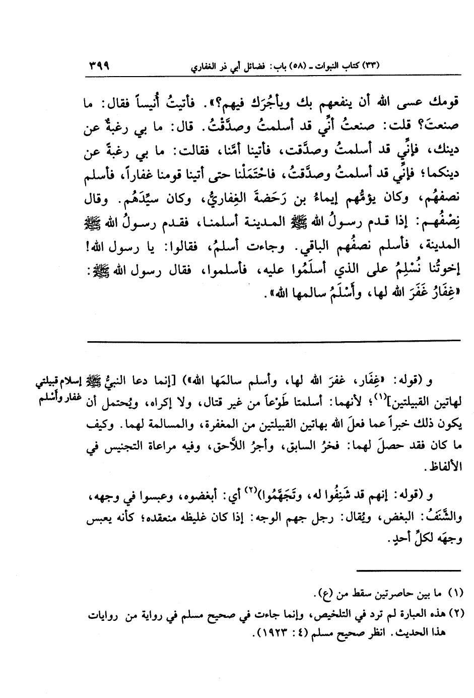 قَومَكَ عَسَى اللَّهُ أَن يَنفَعَهُم بِكَ وَيَأجُرَكَ فِيهِم؟ فَأَتَيتُ أُنَيسًا، فَقَالَ: مَا صَنَعتَ؟ قُلتُ: صَنَعتُ أَنِّي قَد أَسلَمتُ وَصَدَّقتُ. قَالَ: مَا بِي رَغبَةٌ عَن دِينِكَ، فَإِنِّي قَد أَسلَمتُ وَصَدَّقتُ! فَأَتَينَا أُمَّنَا، فَقَالَت: مَا بِي رَغبَةٌ عَن دِينِكُمَا، فَإِنِّي قَد أَسلَمتُ وَصَدَّقتُ! فَاحتَمَلنَا حَتَّى أَتَينَا قَومَنَا غِفَارًا فَأَسلَمَ نِصفُهُم، وَكَانَ يَؤُمُّهُم إيمَاءُ بنُ رَحَضَةَ الغِفَارِيُّ وَكَانَ سَيِّدَهُم، وَقَالَ نِصفُهُم: إِذَا قَدِمَ رَسُولُ اللَّهِ صَلَّى اللَّهُ عَلَيهِ وَسَلَّمَ المَدِينَةَ أَسلَمنَا! فَقَدِمَ رَسُولُ اللَّهِ صَلَّى اللَّهُ عَلَيهِ وَسَلَّمَ المَدِينَةَ فَأَسلَمَ نِصفُهُم البَاقِي، وَجَاءَت أَسلَمُ فَقَالُوا: يَا رَسُولَ اللَّهِ، إِخوَتُنَا! نُسلِمُ عَلَى الَّذِي أَسلَمُوا عَلَيهِ - فَأَسلَمُوا، فَقَالَ رَسُولُ اللَّهِ صَلَّى اللَّهُ عَلَيهِ وَسَلَّمَ: غِفَارُ غَفَرَ اللَّهُ لَهَا، وَأسلَمُ سَالَمَهَا اللَّهُ.
