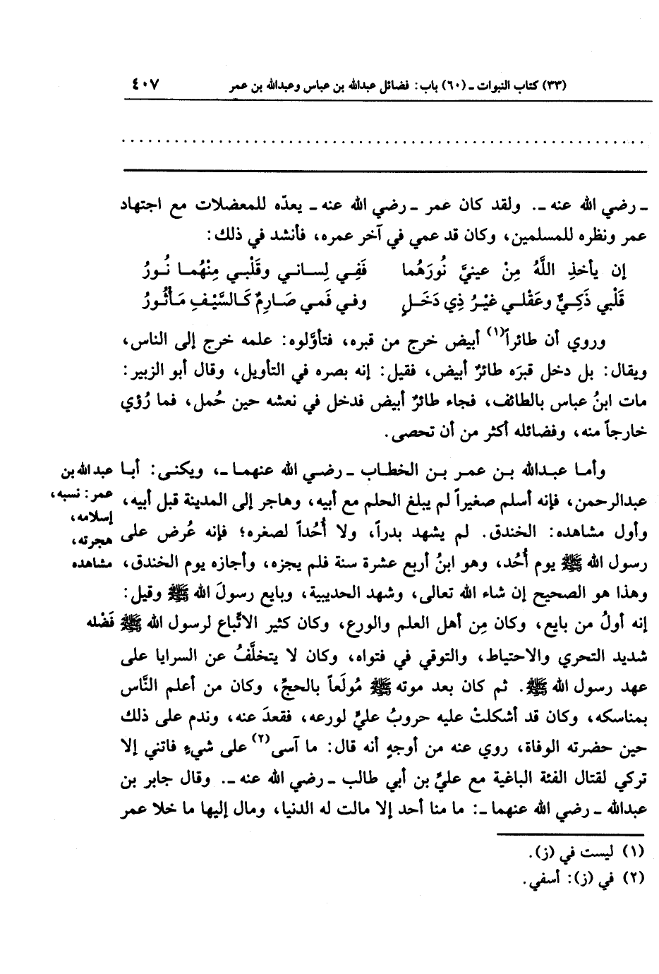 وأما عبد الله بن عمر بن الخطاب رضي الله عنهما - ويُكنى أبا عبد الرحمن - فإنَّه أسلم صغيرًا لم يبلغ الحلم مع أبيه، وهاجر إلى المدينة قبل أبيه، وأول مشاهده الخندق، لم يشهد بدرًا ولا أحدًا لصغره؛ فإنَّه عرض على رسول الله ـ صلى الله عليه وسلم ـ يوم أحد وهو ابن أربع عشرة سنة فلم يجزه، وأجازه يوم الخندق، وهذا هو الصحيح إن شاء الله تعالى. وشهد الحديبية، وبايع رسول الله صلى الله عليه وسلم، وقيل: إنه أول من بايع، وكان من أهل العلم والورع، وكان كثير الاتباع لرسول الله ـ صلى الله عليه وسلم ـ شديد التحري والاحتياط والتوقي في فتواه، وكان لا يتخلَّف عن السرايا على عهد رسول الله صلى الله عليه وسلم، ثم كان بعد موته ـ صلى الله عليه وسلم ـ مُولِعًا بالحج، وكان من أعلم الناس بمناسكه، وكان قد أشكلت عليه حروب عليٍّ لورعه فقعد عنه، وندم على ذلك حين حضرته الوفاة، روي عنه من أوجه أنه قال: ما آسى (¬2) على شيء فاتني إلا تركي لقتال الفئة الباغية مع علي بن أبي طالب رضي الله عنه.