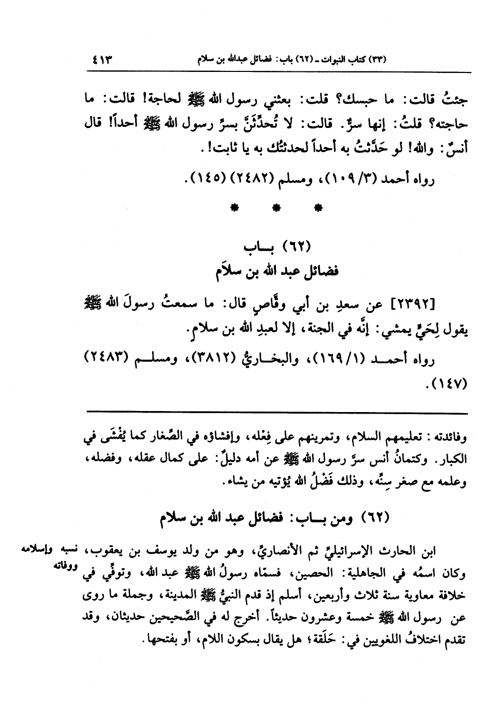 [2392] عن سَعدٍ بن أبي وقاص قَالَ: مَا سَمِعتُ رَسُولَ اللَّهِ صَلَّى اللَّهُ عَلَيهِ وَسَلَّمَ يَقُولُ لِحَيٍّ يَمشِي إِنَّهُ فِي الجَنَّةِ إِلَّا لِعَبدِ اللَّهِ بنِ سَلَامٍ.