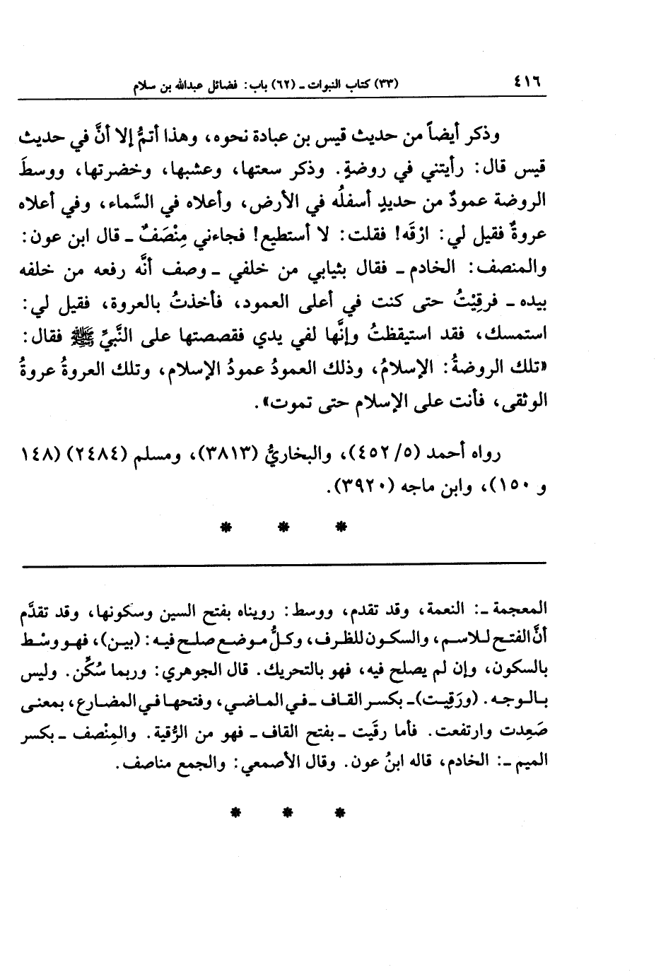 وذكر أيضا من حديث قيس بن عبادة نحوه، وهذا أتم إلا أن في حديث قيس قال: رَأَيتُنِي فِي رَوضَةٍ - وذَكَرَ سَعَتَهَا وَعُشبَهَا وَخُضرَتَهَا، وَوَسطَ الرَّوضَةِ عَمُودٌ مِن حَدِيدٍ أَسفَلُهُ فِي الأَرضِ وَأَعلَاهُ فِي السَّمَاءِ، وفِي أَعلَاهُ عُروَةٌ، فَقِيلَ لِي: ارقَه! فَقُلتُ: لَا أَستَطِيعُ! فَجَاءَنِي مِنصَفٌ - قَالَ ابنُ عَونٍ: وَالمِنصَفُ الخَادِمُ - فَقَالَ بِثِيَابِي مِن خَلفِي - وَصَفَ أَنَّهُ رَفَعَهُ مِن خَلفِهِ بِيَدِهِ - فَرَقِيتُ حَتَّى كُنتُ فِي أَعلَى العَمُودِ، فَأَخَذتُ بِالعُروَةِ فَقِيلَ لِيَ: استَمسِك. فَقَد استَيقَظتُ وَإِنَّهَا لَفِي يَدِي، فَقَصَصتُهَا عَلَى النَّبِيِّ صَلَّى اللَّهُ عَلَيهِ وَسَلَّمَ فَقَالَ: تِلكَ الرَّوضَةُ الإِسلَامُ، وَذَلِكَ العَمُودُ عَمُودُ الإِسلَامِ، وَتِلكَ العُروَةُ عُروَةُ الوُثقَى، فَأَنتَ عَلَى الإِسلَامِ حَتَّى تَمُوتَ.