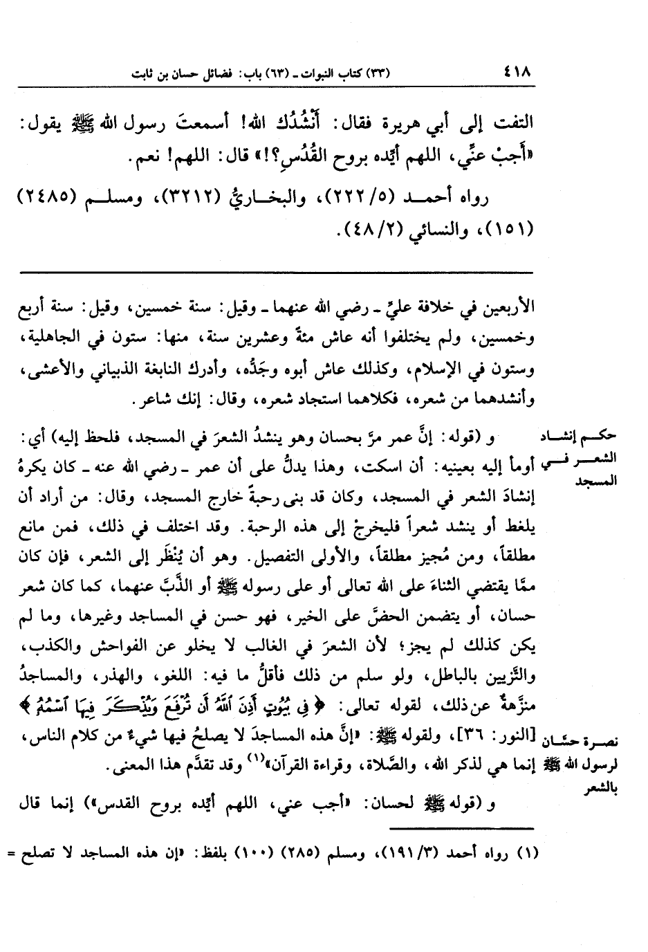 التَفَتَ إِلَى أَبِي هُرَيرَةَ فَقَالَ: أَنشُدُكَ اللَّهَ، أَسَمِعتَ رَسُولَ اللَّهِ صَلَّى اللَّهُ عَلَيهِ وَسَلَّمَ يَقُولُ: أَجِب عَنِّي، اللَّهُمَّ أَيِّدهُ بِرُوحِ القُدُسِ؟ قَالَ: اللَّهُمَّ نَعَم.
