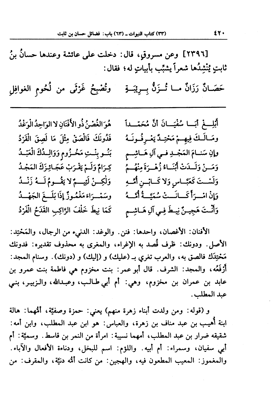 [2396] وعَن مَسرُوقٍ قَالَ: دَخَلتُ عَلَى عَائِشَةَ وَعِندَهَا حَسَّانُ بنُ ثَابِتٍ يُنشِدُهَا شِعرًا يُشَبِّبُ بِأَبيَاتٍ لَهُ، فَقَالَ: