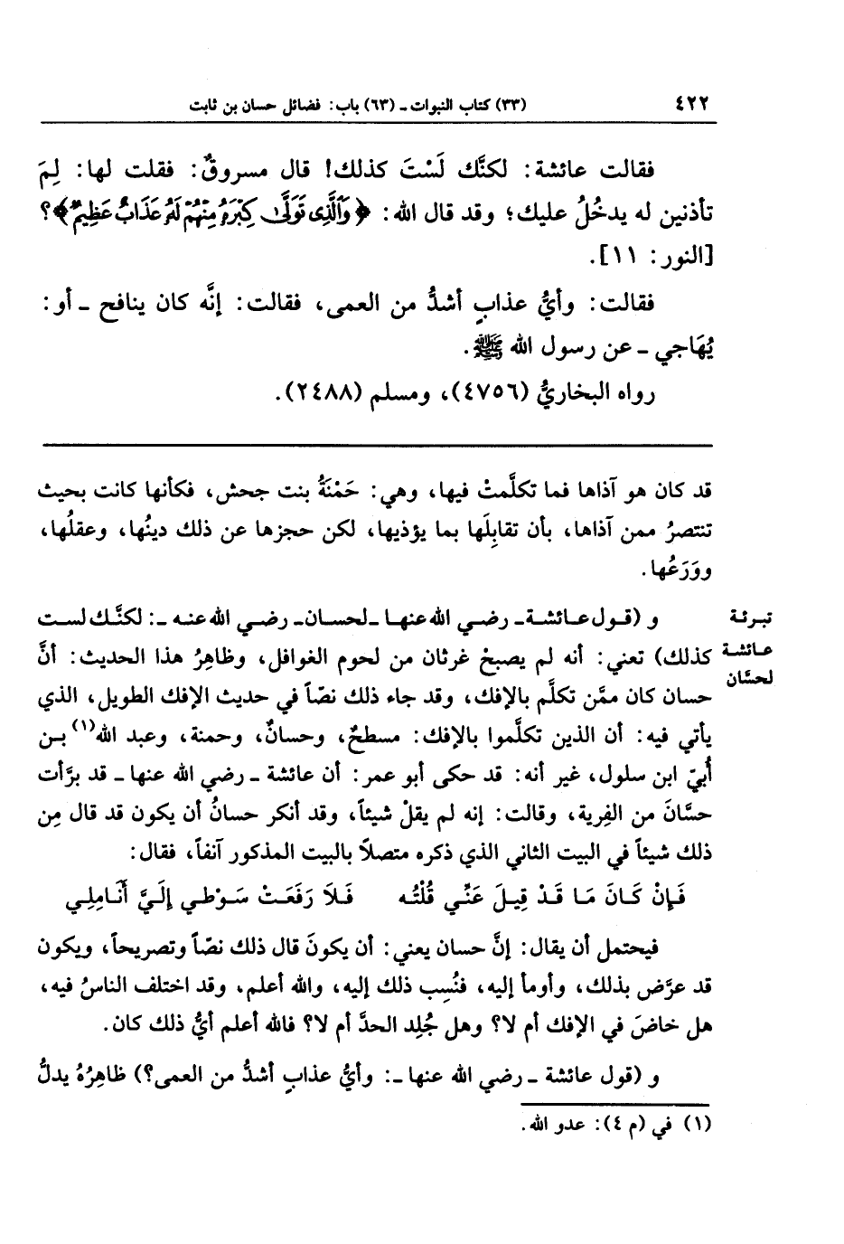 و(قول عائشة رضي الله عنها لحسان رضي الله عنه: لكنك لست كذلك) تعني أنه لم يصبح غرثان من لحوم الغوافل، وظاهر هذا الحديث أن حسان كان ممن تكلم بالإفك، وقد جاء ذلك نصًّا في حديث الإفك الطويل الذي يأتي فيه أن الذين تكلموا بالإفك مسطح وحسان وحمنة وعبد الله (¬1) بن أُبىِّ ابن سلول، غير أنه قد حكى أبو عمر أن عائشة رضي الله عنها قد برَّأت حسَّان من الفرية وقالت: إنه لم يقل شيئًا! وقد أنكر حسان أن يكون قد قال من ذلك شيئًا في البيت الثاني الذي ذكره متصلًا بالبيت المذكور آنفًا، فقال: