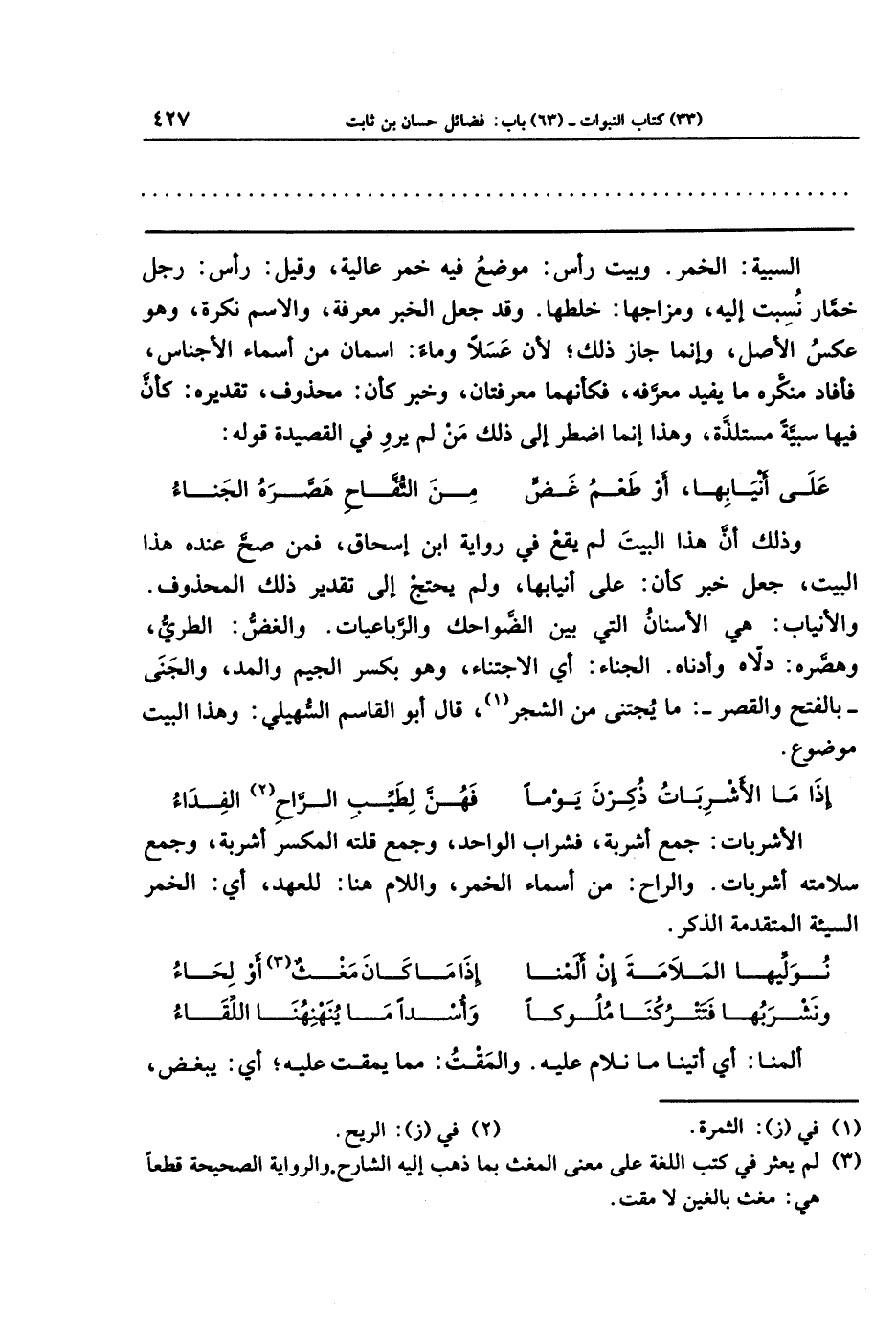وذلك أن هذا البيت لم يقع في رواية ابن إسحاق، فمن صحَّ عنده هذا البيت جعل خبر كأن على أنيابها ولم يحتَج إلى تقدير ذلك المحذوف. والأنياب: هي الأسنان التي بين الضَّواحك والرُّباعيات. والغَضُّ: الطري، وهصَّره: دلاَّه وأدناه. الجناء: أي الاجتناء، وهو بكسر الجيم والمد، والجنى - بالفتح والقصر- ما يُجتنى من الشجر (¬1)، قال أبو القاسم السُّهيلي: وهذا البيت موضوع.