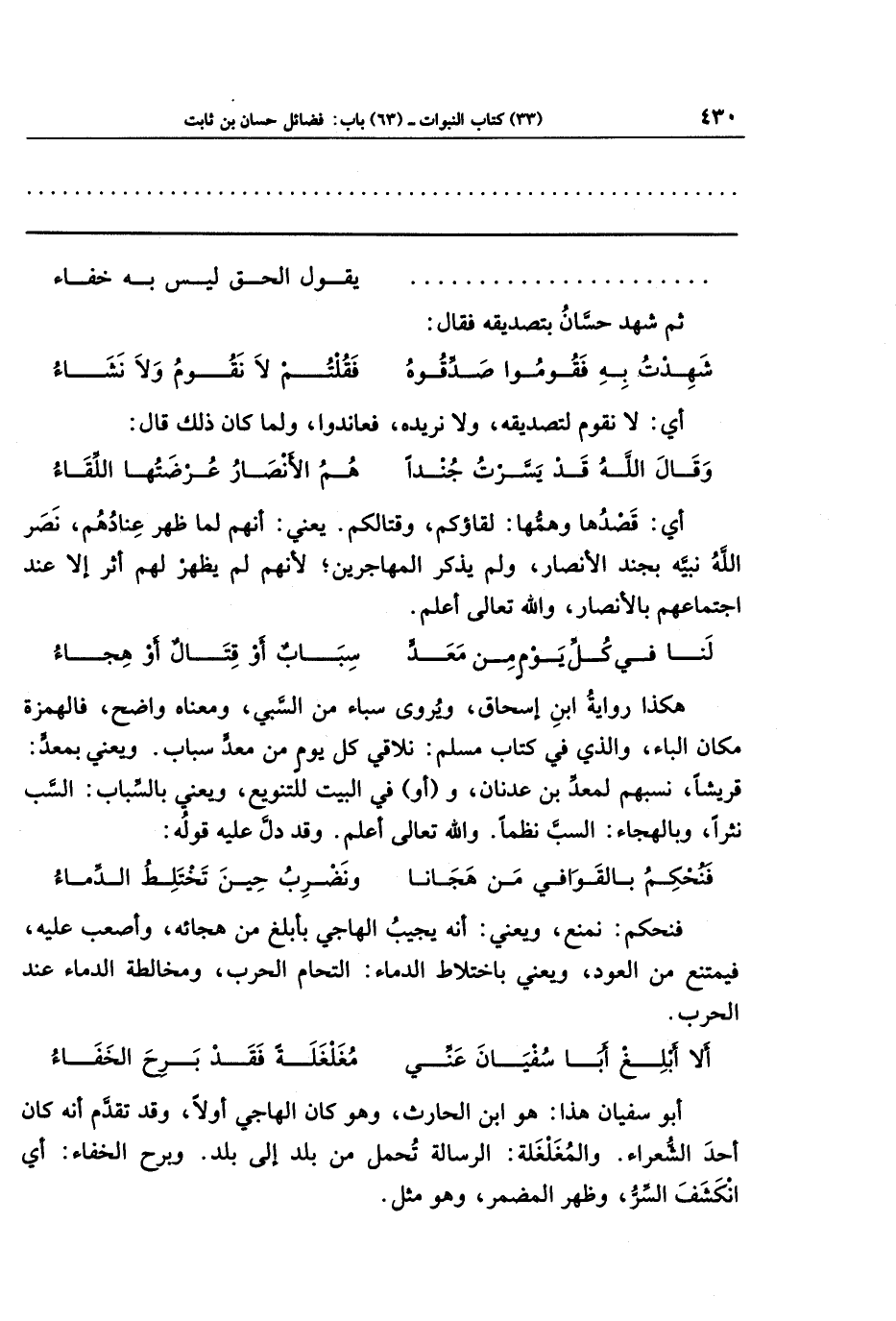 هكذا رواية ابن إسحاق، ويروى سباء من السَّبي، ومعناه واضح، فالهمزة مكان الباء، والذي في كتاب مسلم نلاقي كل يوم من معدٍّ سباب، ويعني بمعدٍّ قريشًا، نسبهم لمعدِّ بن عدنان، وأو في البيت للتنويع، ويعني بالسباب السب نثرًا، وبالهجاء السب نظمًا، والله تعالى أعلم.