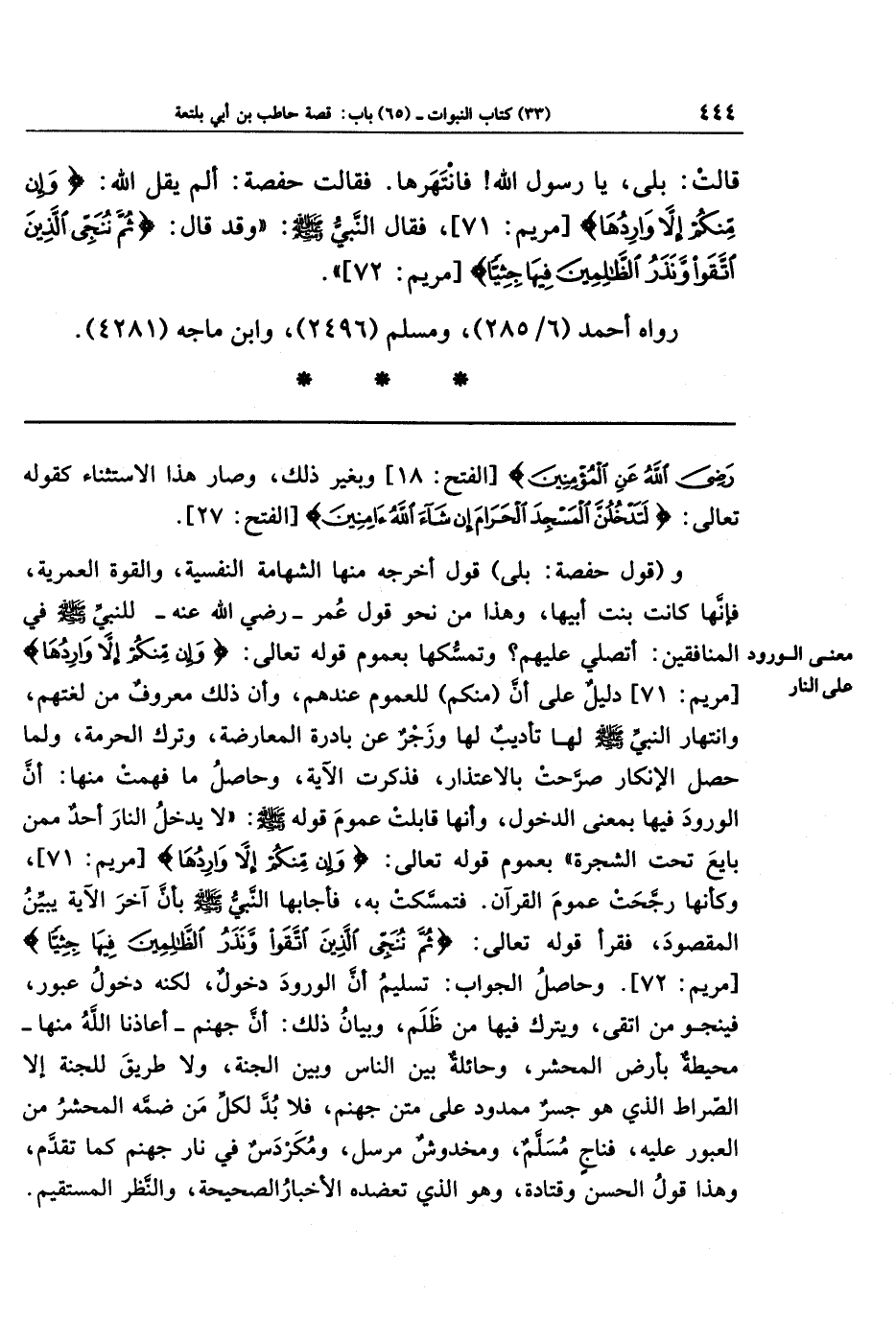 و(قول حفصة بلى) قول أخرجه منها الشهامة النفسية والقوة العمرية، فإنَّها كانت بنت أبيها، وهذا من نحو قول عمر رضي الله عنه للنبي ـ صلى الله عليه وسلم ـ في المنافقين: أتصلي عليهم؟ وتمسكها بعموم قوله تعالى: {وَإِن مِنكُم إِلا وَارِدُهَا} دليلٌ على أن منكم للعموم عندهم وأن ذلك معروف من لغتهم، وانتهار النبي ـ صلى الله عليه وسلم ـ لها تأديب لها وزجر عن بادرة المعارضة وترك الحرمة، ولما حصل الإنكار صرحت بالاعتذار فذكرت الآية، وحاصل ما فهمت منها أن الورود فيها بمعنى الدخول وأنها قابلت عموم قوله صلى الله عليه وسلم لا يدخل النار أحدٌ ممن بايع تحت الشجرة بعموم قوله تعالى {وَإِن مِنكُم إِلا وَارِدُهَا} وكأنها رجَّحت عموم القرآن فتمسكت به، فأجابها النبي ـ صلى الله عليه وسلم ـ بأن آخر الآية يبيِّن المقصود، فقرأ قوله تعالى {ثُمَّ نُنَجِّي الَّذِينَ اتَّقَوا وَنَذَرُ الظَّالِمِينَ فِيهَا جِثِيًّا} وحاصل الجواب تسليم أن الورود دخول، لكنه دخول عبور، فينجو من اتقى، ويترك فيها من ظلم، وبيان ذلك أن جهنم - أعاذنا الله منها - محيطة بأرض المحشر وحائلة بين الناس وبين الجنة، ولا طريق للجنة إلا الصراط الذي هو جسر ممدود على متن جهنم، فلا بدَّ لكل من ضمَّه المحشر من العبور عليه؛ فناج مُسَلَّم، ومخدوش مرسل، ومكردسٌ في نار جهنم - كما تقدَّم، وهذا قول الحسن وقتادة، وهو الذي تعضده الأخبار الصحيحة والنظر المستقيم.