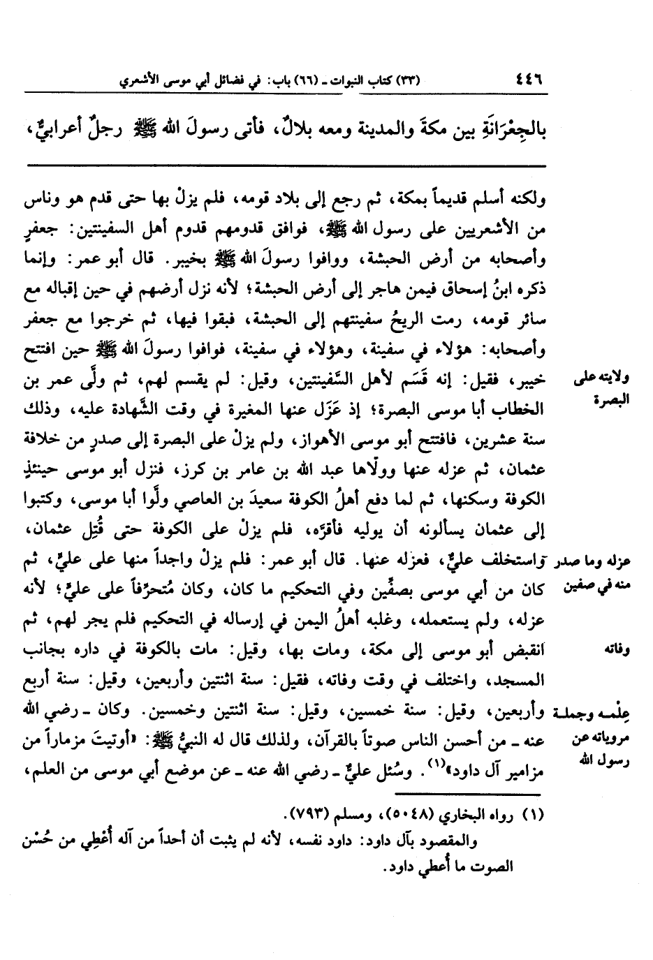 ثم ولَّى عمر بن الخطاب أبا موسى البصرة إذ عزل عنها المغيرة في وقت الشهادة عليه، وذلك سنة عشرين، فافتتح أبو موسى الأهواز، ولم يزل على البصرة إلى صدر من خلافة عثمان ثم عزله عنها وولاها عبد الله بن عامر بن كرز، فنزل أبو موسى حينئذ الكوفة وسكنها، ثم لما دفع أهل الكوفة سعيد بن العاصي ولَّوا أبا موسى، وكتبوا إلى عثمان يسألونه أن يوليه فأقرَّه، فلم يزل على الكوفة حتى قتل عثمان واستخلف عليّ فعزله عنها. قال أبو عمر: فلم يزل واجدًا منها على علي، ثم كان من أبي موسى بصفين وفي التحكيم ما كان، وكان متحرفًا على عليٍّ لأنَّه عزله ولم يستعمله، وغلبه أهل اليمن في إرساله في التحكيم فلم يجر لهم، ثم انقبض أبو موسى إلى مكة ومات بها، وقيل: مات بالكوفة في داره بجانب المسجد. واختلف في وقت وفاته؛ فقيل: سنة اثنتين وأربعين، وقيل: سنة أربع وأربعين، وقيل: سنة خمسين، وقيل: سنة اثنتين وخمسين. وكان رضي الله عنه من أحسن الناس صوتًا بالقرآن، ولذلك قال له النبي صلى الله عليه وسلم: أوتيت مزمارًا من مزامير آل داود (¬1)، وسئل علي رضي الله عنه عن موضع أبي موسى من العلم