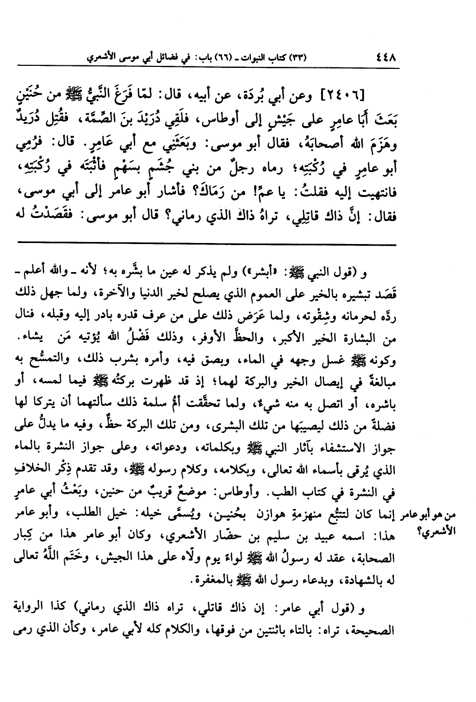 [2406] وعَن أَبِي بُردَةَ، عَن أَبِيهِ قَالَ: لَمَّا فَرَغَ النَّبِيُّ صَلَّى اللَّهُ عَلَيهِ وَسَلَّمَ مِن حُنَينٍ بَعَثَ أَبَا عَامِرٍ عَلَى جَيشٍ إِلَى أَوطَاسٍ، فَلَقِيَ دُرَيدَ بنَ الصِّمَّةِ، فَقُتِلَ دُرَيدٌ وَهَزَمَ اللَّهُ أَصحَابَهُ، فَقَالَ أَبُو مُوسَى: وَبَعَثَنِي مَعَ أَبِي عَامِرٍ. قَالَ: فَرُمِيَ أَبُو عَامِرٍ فِي رُكبَتِهِ؛ رَمَاهُ رَجُلٌ مِن بَنِي جُشَمٍ بِسَهمٍ فَأَثبَتَهُ فِي رُكبَتِهِ، فَانتَهَيتُ إِلَيهِ فَقُلتُ: يَا عَمِّ، مَن رَمَاكَ؟ فَأَشَارَ أَبُو عَامِرٍ إِلَى أَبِي مُوسَى فَقَالَ: إِنَّ ذَاكَ قَاتِلِي، تَرَاهُ ذَاكَ الَّذِي رَمَانِي؟ قَالَ أَبُو مُوسَى: فَقَصَدتُ لَهُ
