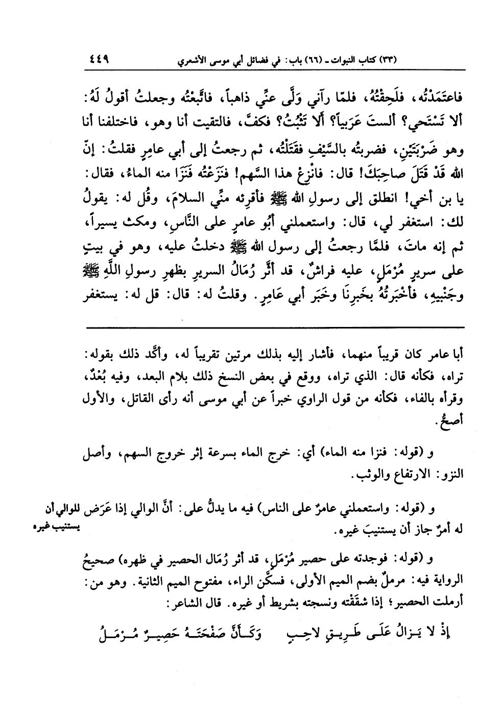فَاعتَمَدتُهُ فَلَحِقتُهُ، فَلَمَّا رَآنِي وَلَّى عَنِّي ذَاهِبًا، فَاتَّبَعتُهُ، وَجَعَلتُ أَقُولُ لَهُ: أَلَا تَستَحيِ؟ أَلَستَ عَرَبِيًّا؟ أَلَا تَثبُتُ؟ فَكَفَّ، فَالتَقَيتُ أَنَا وَهُوَ، فَاختَلَفنَا أَنَا وَهُوَ ضَربَتَينِ، فَضَرَبتُهُ بِالسَّيفِ فَقَتَلتُهُ، ثُمَّ رَجَعتُ إِلَى أَبِي عَامِرٍ فَقُلتُ: إِنَّ اللَّهَ قَد قَتَلَ صَاحِبَكَ! قَالَ: فَانزِع هَذَا السَّهمَ! فَنَزَعتُهُ فَنَزَا مِنهُ المَاءُ، فَقَالَ: يَا ابنَ أَخِي، انطَلِق إِلَى رَسُولِ اللَّهِ صَلَّى اللَّهُ عَلَيهِ وَسَلَّمَ فَأَقرِئهُ مِنِّي السَّلَامَ، وَقُل لَهُ: يَقُولُ لَكَ استَغفِر لِي! قَالَ: وَاستَعمَلَنِي أَبُو عَامِرٍ عَلَى النَّاسِ، وَمَكَثَ يَسِيرًا ثُمَّ إِنَّهُ مَاتَ، فَلَمَّا رَجَعتُ إِلَى رسول الله صَلَّى اللَّهُ عَلَيهِ وَسَلَّمَ دَخَلتُ عَلَيهِ وَهُوَ فِي بَيتٍ عَلَى سَرِيرٍ مُرمَلٍ عَلَيهِ فِرَاشٌ، قَد أَثَّرَ رِمَالُ السَّرِيرِ بِظَهرِ رَسُولِ اللَّهِ صَلَّى اللَّهُ عَلَيهِ وَسَلَّمَ وَجَنبَيهِ، فَأَخبَرتُهُ بِخَبَرِنَا وَخَبَرِ أَبِي عَامِرٍ، وَقُلتُ لَهُ: قَالَ: قُل لَهُ يَستَغفِر