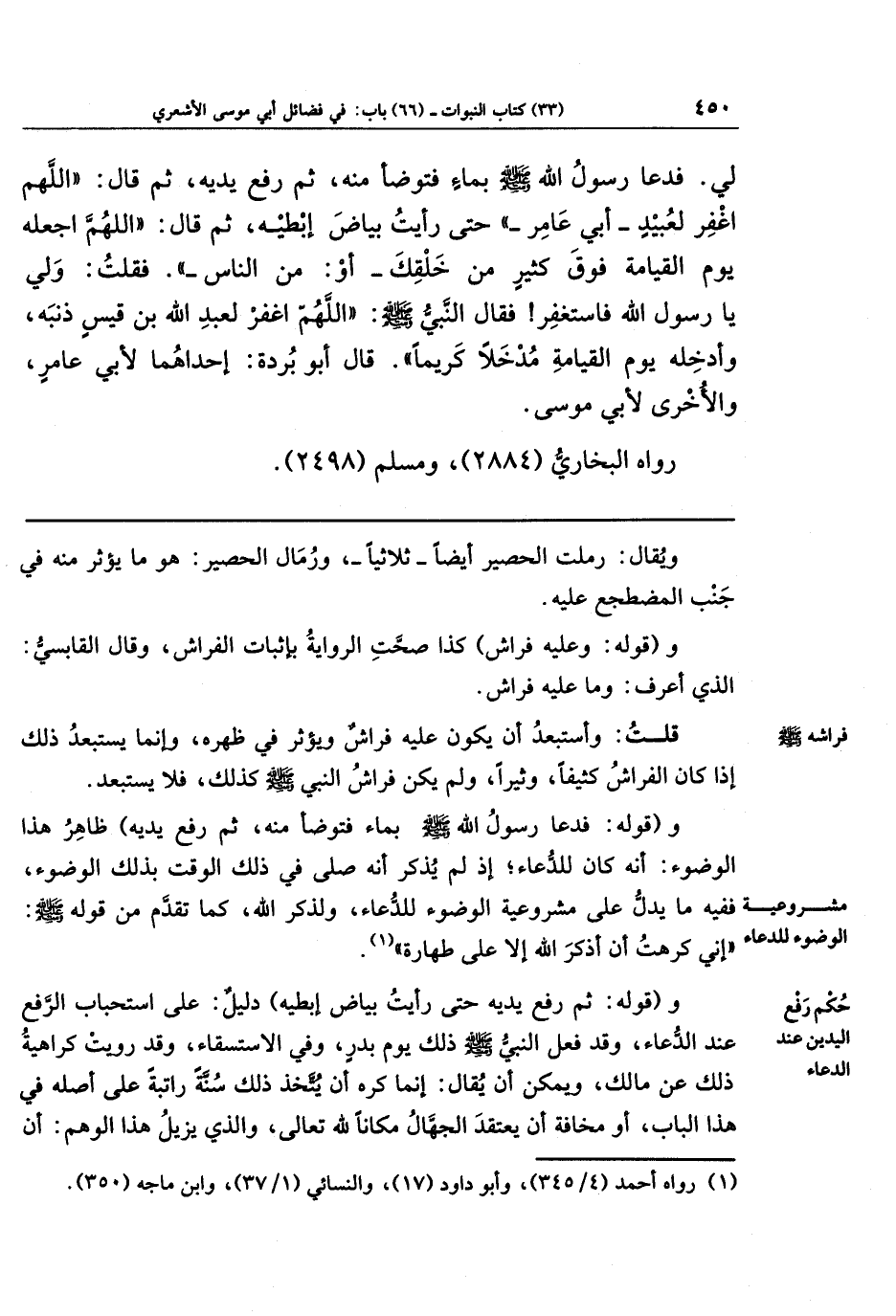 لِي. فَدَعَا رَسُولُ اللَّهِ صَلَّى اللَّهُ عَلَيهِ وَسَلَّمَ بِمَاءٍ فَتَوَضَّأَ مِنهُ، ثُمَّ رَفَعَ يَدَيهِ، ثُمَّ قَالَ: اللَّهُمَّ اغفِر لِعُبَيدٍ - أَبِي عَامِرٍ - حَتَّى رَأَيتُ بَيَاضَ إِبطَيهِ، ثُمَّ قَالَ: اللَّهُمَّ اجعَلهُ يَومَ القِيَامَةِ فَوقَ كَثِيرٍ مِن خَلقِكَ - أَو مِن النَّاسِ، فَقُلتُ: وَلِي يَا رَسُولَ اللَّهِ فَاستَغفِر! فَقَالَ النَّبِيُّ صَلَّى اللَّهُ عَلَيهِ وَسَلَّمَ: اللَّهُمَّ اغفِر لِعَبدِ اللَّهِ بنِ قَيسٍ ذَنبَهُ، وَأَدخِلهُ يَومَ القِيَامَةِ مُدخَلًا كَرِيمًا. قَالَ أَبُو بُردَةَ: إِحَدَاهُمَا لِأَبِي عَامِرٍ، وَالأُخرَى لِأَبِي مُوسَى.