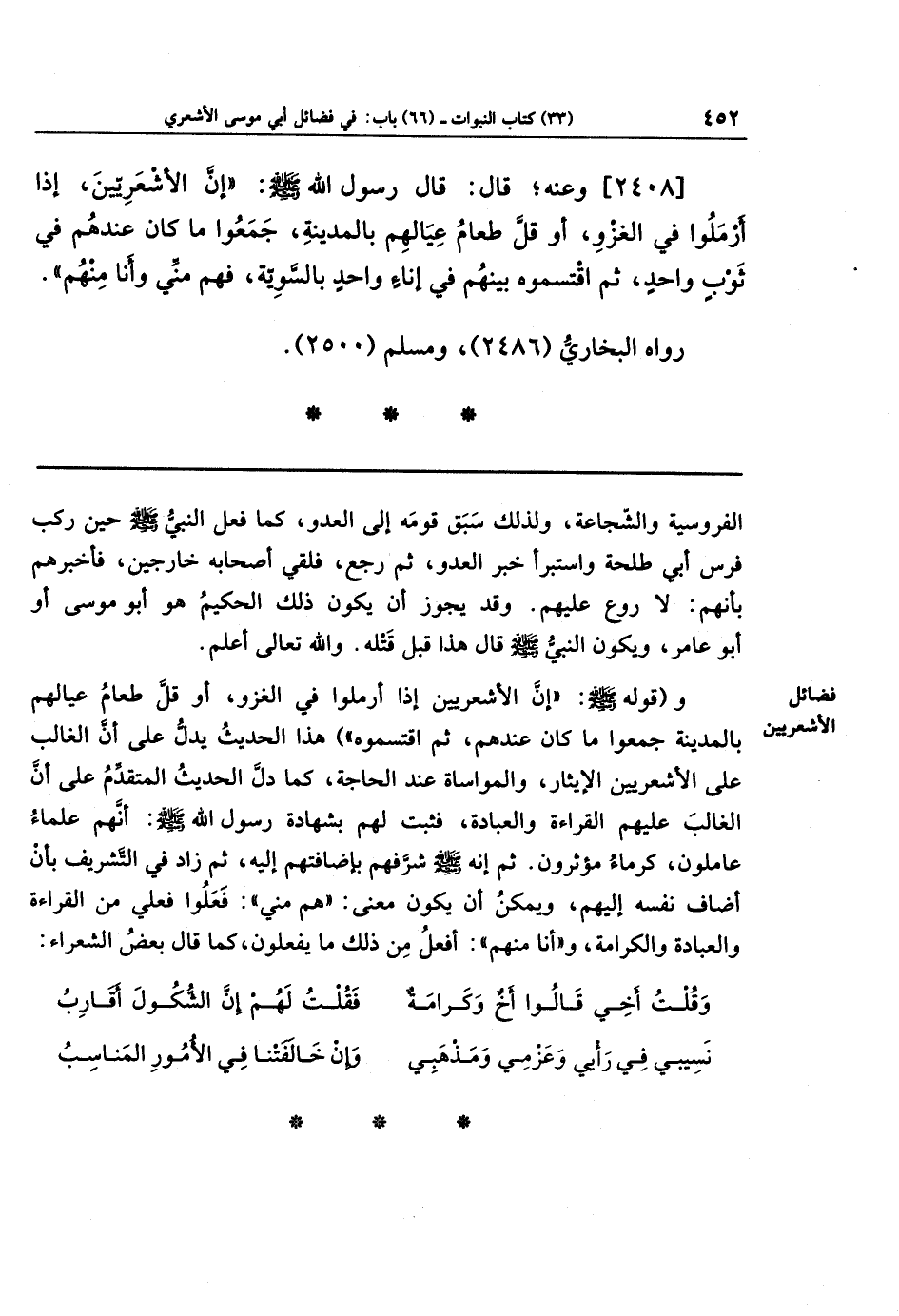 و(قوله صلى الله عليه وسلم إن الأشعريين إذا أرملوا في الغزو أو قل طعام عيالهم بالمدينة جمعوا ما كان عندهم ثم اقتسموه)، هذا الحديث يدل على أن الغالب على الأشعريين الإيثار والمواساة عند الحاجة، كما دلَّ الحديث المتقدِّم على أن الغالب عليهم القراءة والعبادة، فثبت لهم بشهادة رسول الله ـ صلى الله عليه وسلم ـ أنَّهم علماء عاملون كرماء مؤثرون. ثم إنه ـ صلى الله عليه وسلم ـ شرَّفهم بإضافتهم إليه، ثم زاد في التشريف بأن أضاف نفسه إليهم، ويمكن أن يكون معنى هم مني: فعلوا فعلي من القراءة والعبادة والكرامة، وأنا منهم: أفعل من ذلك ما يفعلون، كما قال بعض الشعراء: