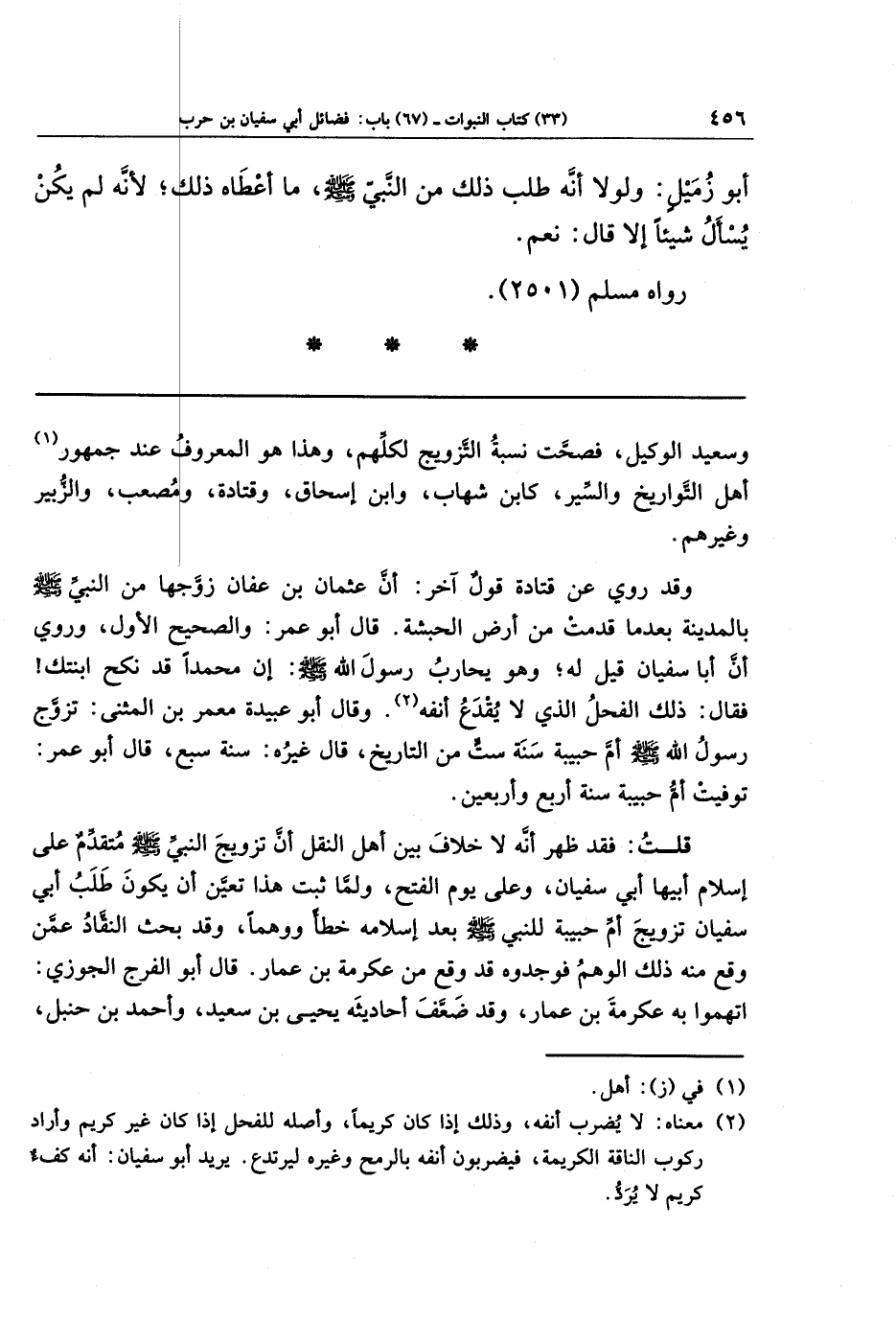 قلت: فقد ظهر أنه لا خلاف بين أهل النقل أن تزويج النبي ـ صلى الله عليه وسلم ـ متقدِّم على إسلام أبيها أبي سفيان، وعلى يوم الفتح، ولما ثبت هذا تعيَّن أن يكون طلب أبي سفيان تزويج أم حبيبة للنبي ـ صلى الله عليه وسلم ـ بعد إسلامه خطأ ووهمًا، وقد بحث النقاد عمن وقع منه ذلك الوهم فوجدوه قد وقع من عكرمة بن عمار. قال أبو الفرج الجوزي: اتهموا به عكرمة بن عمار، وقد ضعف أحاديثه يحيى بن سعيد، وأحمد بن حنبل،