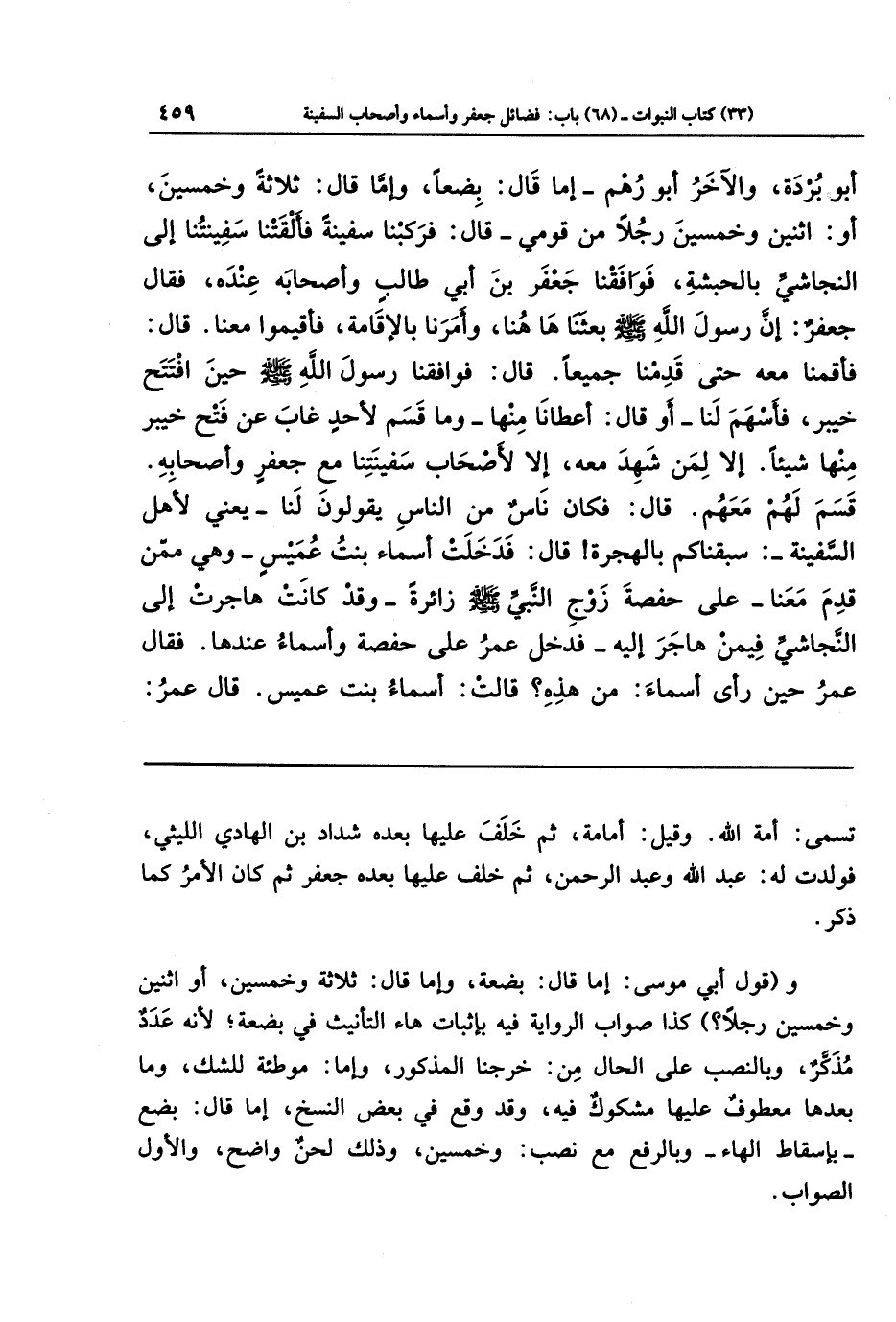 أَبُو بُردَةَ وَالآخَرُ أَبُو رُهمٍ - إِمَّا قَالَ: بِضعًا، وَإِمَّا قَالَ: ثَلَاثَةً وَخَمسِينَ أَو اثنَينِ وَخَمسِينَ رَجُلًا مِن قَومِي - قَالَ: فَرَكِبنَا سَفِينَةً، فَأَلقَتنَا سَفِينَتُنَا إِلَى النَّجَاشِيِّ بِالحَبَشَةِ، فَوَافَقنَا جَعفَرَ بنَ أَبِي طَالِبٍ وَأَصحَابَهُ عِندَهُ. فَقَالَ جَعفَرٌ: إِنَّ رَسُولَ اللَّهِ صَلَّى اللَّهُ عَلَيهِ وَسَلَّمَ بَعَثَنَا هَاهُنَا وَأَمَرَنَا بِالإِقَامَةِ، فَأَقِيمُوا مَعَنَا، قال: فَأَقَمنَا مَعَهُ حَتَّى قَدِمنَا جَمِيعًا، قَالَ: فَوَافَقنَا رَسُولَ اللَّهِ صَلَّى اللَّهُ عَلَيهِ وَسَلَّمَ حِينَ افتَتَحَ خَيبَرَ، فَأَسهَمَ لَنَا - أَو قَالَ أَعطَانَا مِنهَا - وَمَا قَسَمَ لِأَحَدٍ غَابَ عَن فَتحِ خَيبَرَ مِنهَا شَيئًا إِلَّا لِمَن شَهِدَ مَعَهُ، إِلَّا لِأَصحَابِ سَفِينَتِنَا مَعَ جَعفَرٍ وَأَصحَابِهِ، قَسَمَ لَهُم مَعَهُم. قَال: فَكَانَ نَاسٌ مِن النَّاسِ يَقُولُونَ لَنَا - يَعنِي لِأَهلِ السَّفِينَةِ -: سَبَقنَاكُم بِالهِجرَةِ! قَالَ: فَدَخَلَت أَسمَاءُ بِنتُ عُمَيسٍ - وَهِيَ مِمَّن قَدِمَ مَعَنَا - عَلَى حَفصَةَ زَوجِ النَّبِيِّ - صَلَّى اللَّهُ عَلَيهِ وَسَلَّمَ - زَائِرَةً - وَقَد كَانَت هَاجَرَت إِلَى النَّجَاشِيِّ فِيمَن هَاجَرَ إِلَيهِ - فَدَخَلَ عُمَرُ عَلَى حَفصَةَ وَأَسمَاءُ عِندَهَا، فَقَالَ عُمَرُ حِينَ رَأَى أَسمَاءَ: مَن هَذِهِ؟ قَالَت أَسمَاءُ بِنتُ عُمَيسٍ: قَالَ عُمَرُ: