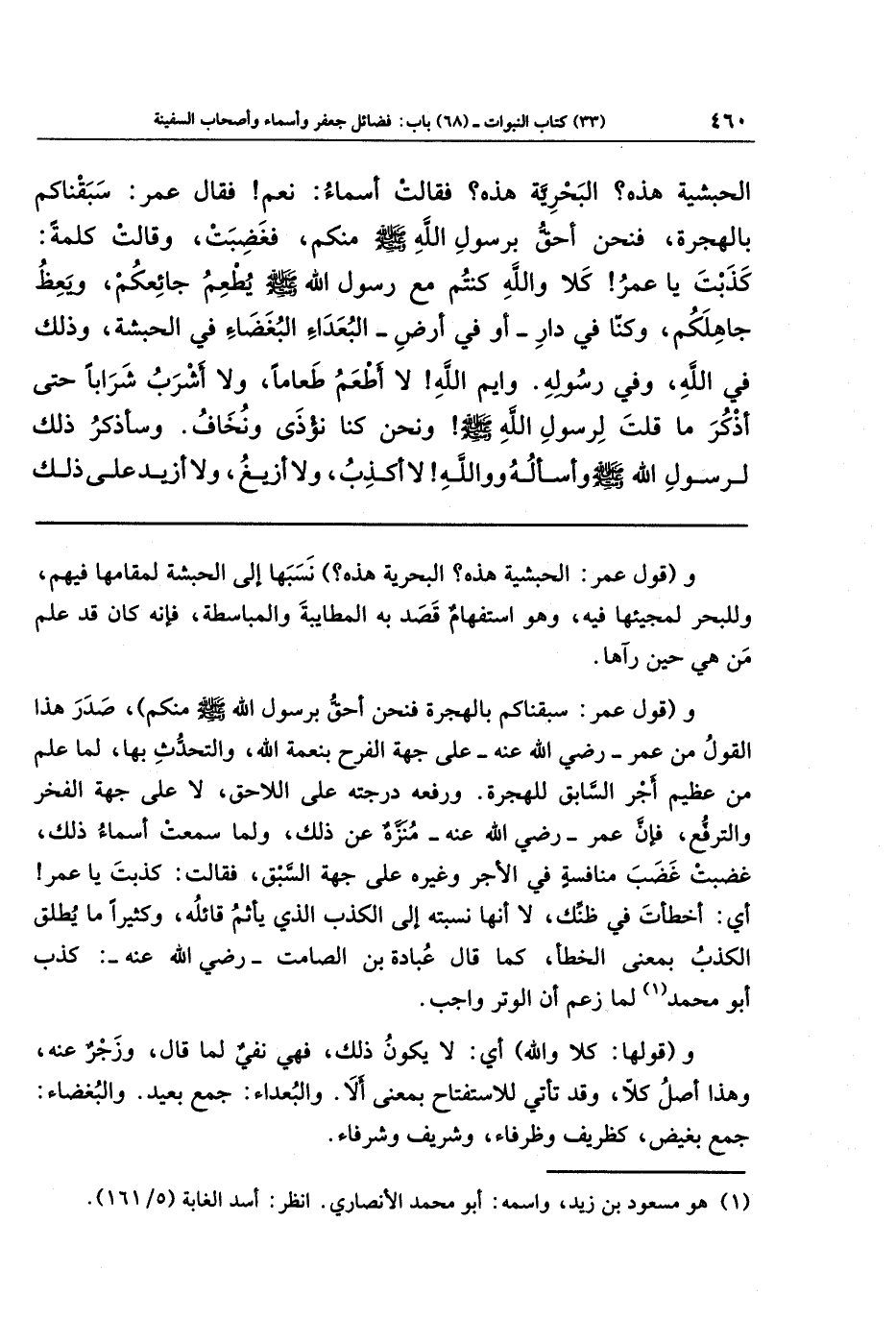 الحَبَشِيَّةُ هَذِهِ؟ البَحرِيَّةُ هَذِهِ؟ فَقَالَت أَسمَاءُ: نَعَم، فَقَالَ عُمَرُ: سَبَقنَاكُم بِالهِجرَةِ فَنَحنُ أَحَقُّ بِرَسُولِ اللَّهِ صَلَّى اللَّهُ عَلَيهِ وَسَلَّمَ مِنكُم فَغَضِبَت، وَقَالَت: كَلِمَةً كَذَبتَ يَا عُمَرُ! كَلَّا وَاللَّهِ كُنتُم مَعَ رَسُولِ اللَّهِ صَلَّى اللَّهُ عَلَيهِ وَسَلَّمَ يُطعِمُ جَائِعَكُم، وَيَعِظُ جَاهِلَكُم، وَكُنَّا فِي دَارِ - أَو فِي أَرضِ - البُعَدَاءِ البُغَضَاءِ فِي الحَبَشَةِ، وَذَلِكَ فِي اللَّهِ وَفِي رَسُولِهِ، وَايمُ اللَّهِ لَا أَطعَمُ طَعَامًا، وَلَا أَشرَبُ شَرَابًا حَتَّى أَذكُرَ مَا قُلتَ لِرَسُولِ اللَّهِ صَلَّى اللَّهُ عَلَيهِ وَسَلَّمَ، وَنَحنُ كُنَّا نُؤذَى وَنُخَافُ، وَسَأَذكُرُ ذَلِكَ لِرَسُولِ اللَّهِ صَلَّى اللَّهُ عَلَيهِ وَسَلَّمَ، وَأَسأَلُهُ، وَوَاللَّهِ! لَا أَكذِبُ وَلَا أَزِيغُ وَلَا أَزِيدُ عَلَى ذَلِكَ.