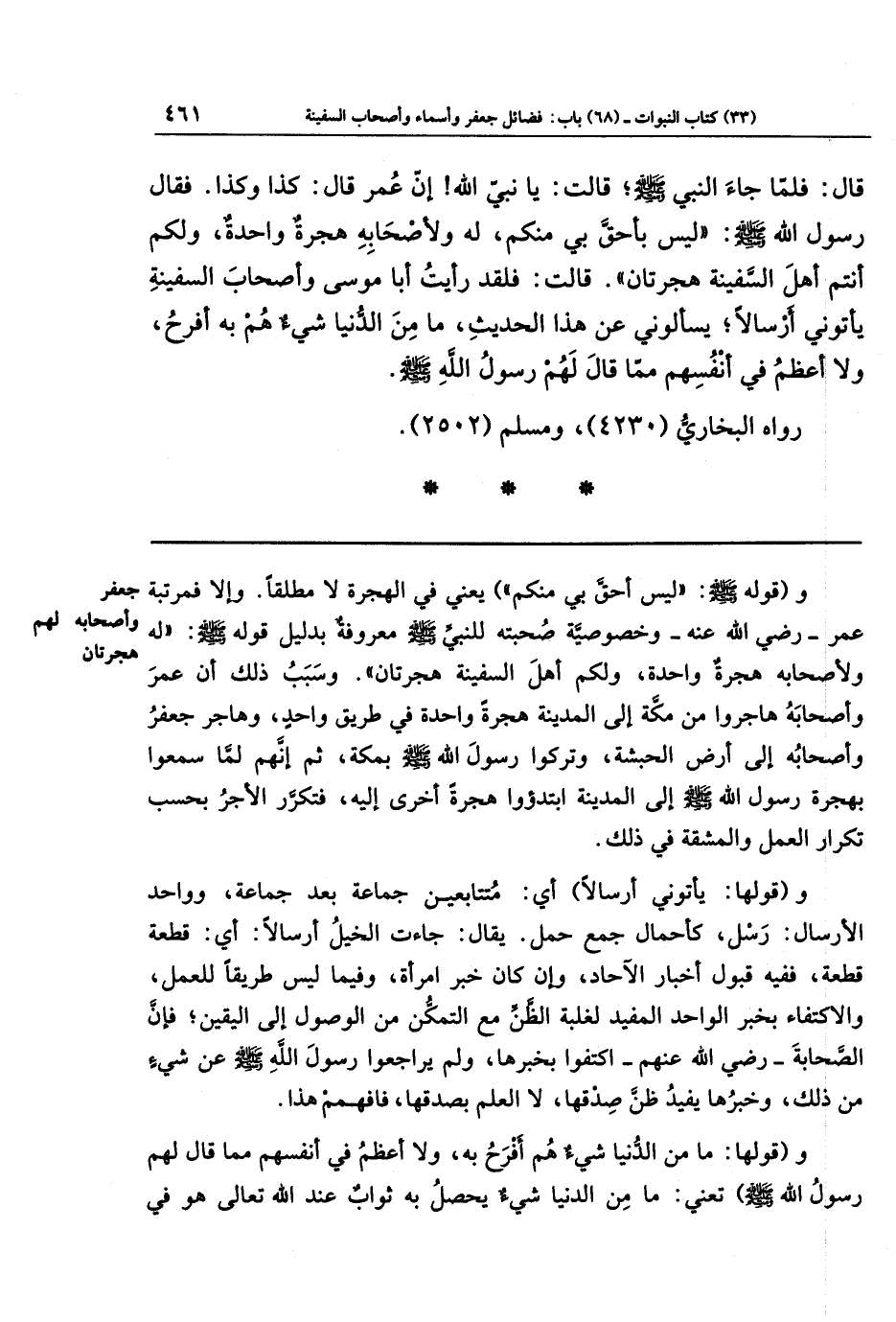 و(قوله ـ صلى الله عليه وسلم ـ: ليس أحق بي منكم) يعني في الهجرة لا مطلقًا. وإلا فمرتبة عمر رضي الله عنه وخصوصية صحبته للنبي ـ صلى الله عليه وسلم ـ معروفة بدليل قوله ـ صلى الله عليه وسلم ـ: له ولأصحابه هجرة واحدة، ولكم أهل السفينة هجرتان. وسبب ذلك أن عمر وأصحابه هاجروا من مكة إلى المدينة هجرة واحدة في طريق واحد، وهاجر جعفر وأصحابه إلى أرض الحبشة، وتركوا رسول الله ـ صلى الله عليه وسلم ـ بمكة، ثم إنهم لما سمعوا بهجرة رسول الله ـ صلى الله عليه وسلم ـ إلى المدينة ابتدؤوا هجرة أخرى إليه، فتكرر الأجر بحسب تكرار العمل والمشقة في ذلك.