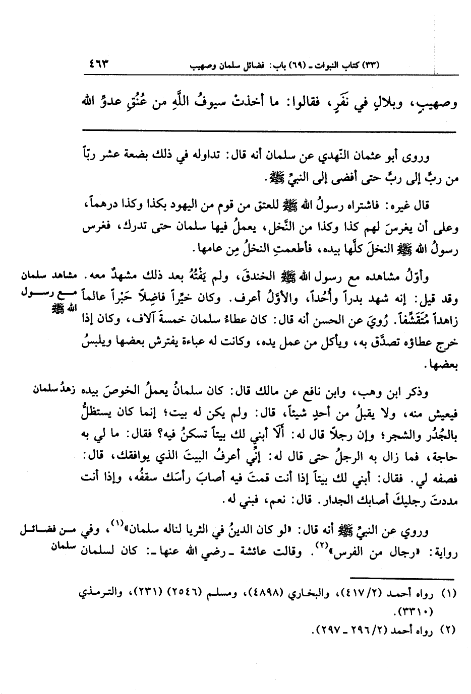 وأوَّل مشاهده مع رسول الله ـ صلى الله عليه وسلم ـ الخندق، ولم يَفُته بعد ذلك مشهد معه. وقد قيل: إنه شهد بدرًا وأحدًا، والأوَّل أعرف. وكان خيِّرًا فاضلًا حَبرًا عالِمًا زاهدًا متقشفًا. روي عن الحسن أنه قال: كان عطاء سلمان خمسة آلاف، وكان إذا خرج عطاؤه تصدق به، ويأكل من عمل يده، وكانت له عباءة يفترش بعضها ويلبس بعضها.