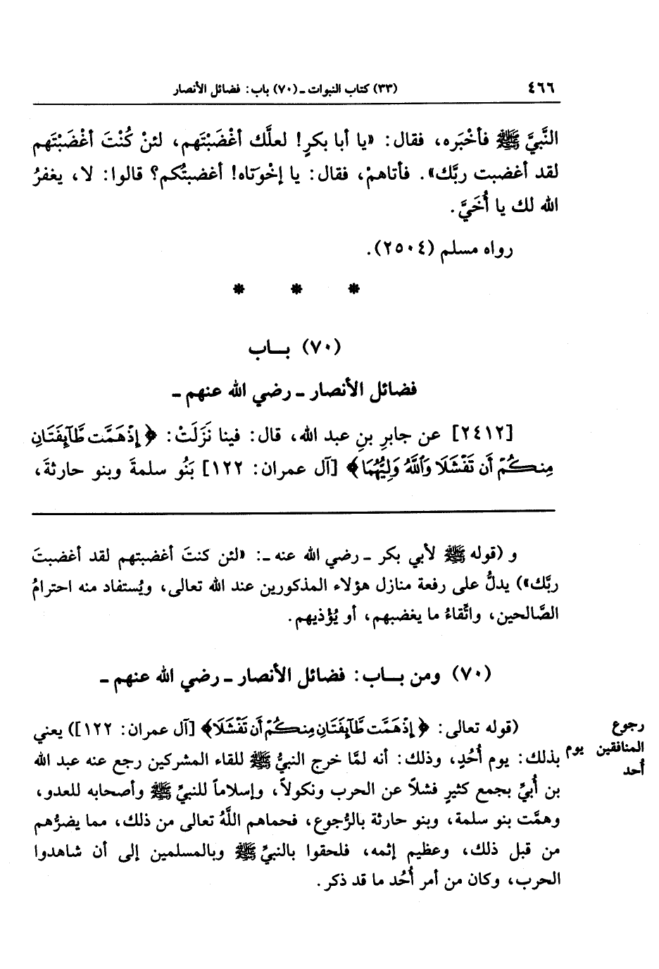 [2412] عَن جَابِرِ بنِ عَبدِ اللَّهِ، قَالَ: فِينَا نَزَلَت: {إِذ هَمَّت طَائِفَتَانِ مِنكُم أَن تَفشَلا وَاللَّهُ وَلِيُّهُمَا} بَنُو سَلِمَةَ وَبَنُو حَارِثَةَ،