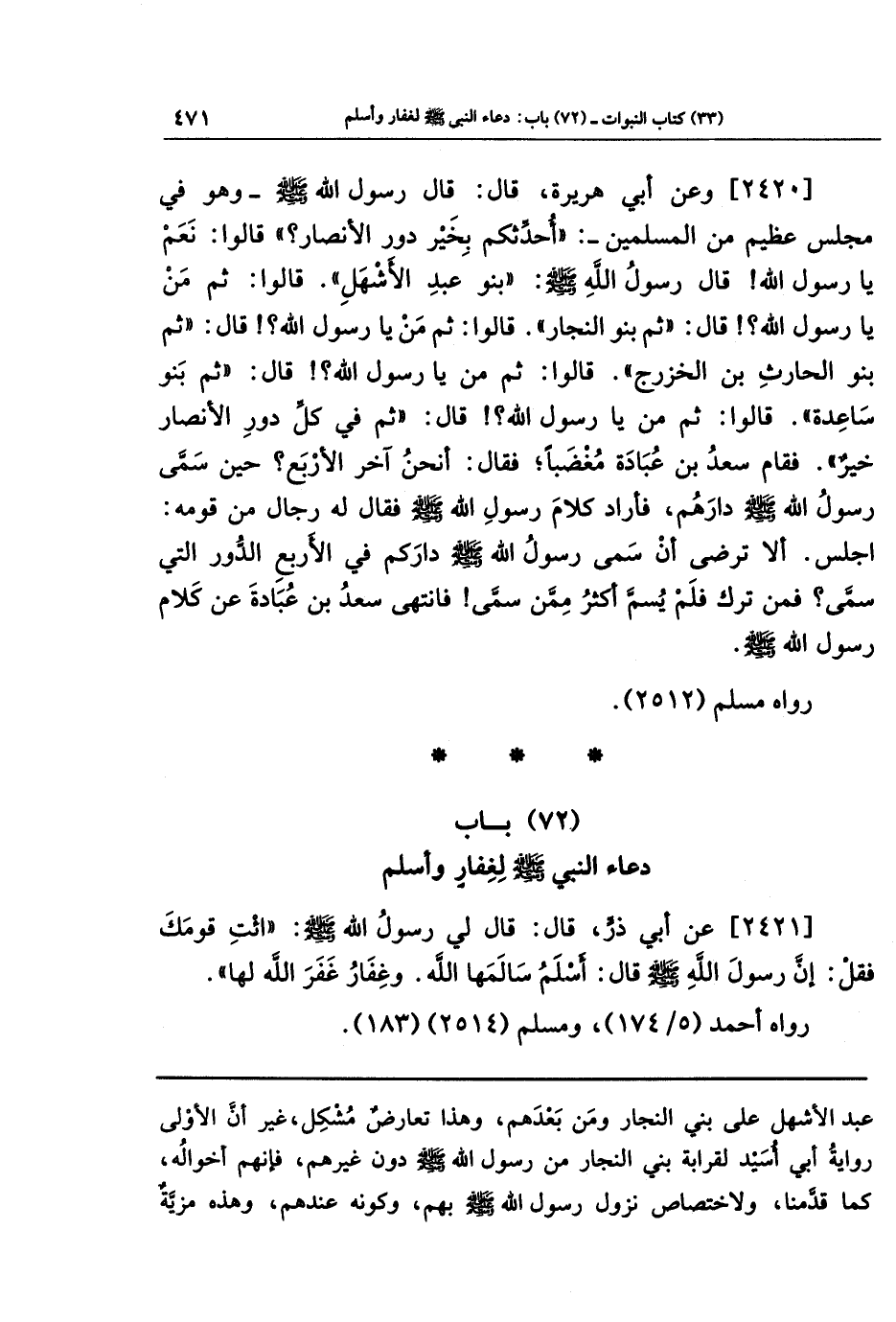 [2421] عَن أَبِي ذَرٍّ قَالَ: قَالَ لِي رَسُولُ اللَّهِ صَلَّى اللَّهُ عَلَيهِ وَسَلَّمَ: ائتِ قَومَكَ فَقُل: إِنَّ رَسُولَ اللَّهِ صَلَّى اللَّهُ عَلَيهِ وَسَلَّمَ قَالَ: أَسلَمُ سَالَمَهَا اللَّهُ، وَغِفَارُ غَفَرَ اللَّهُ لَهَا.