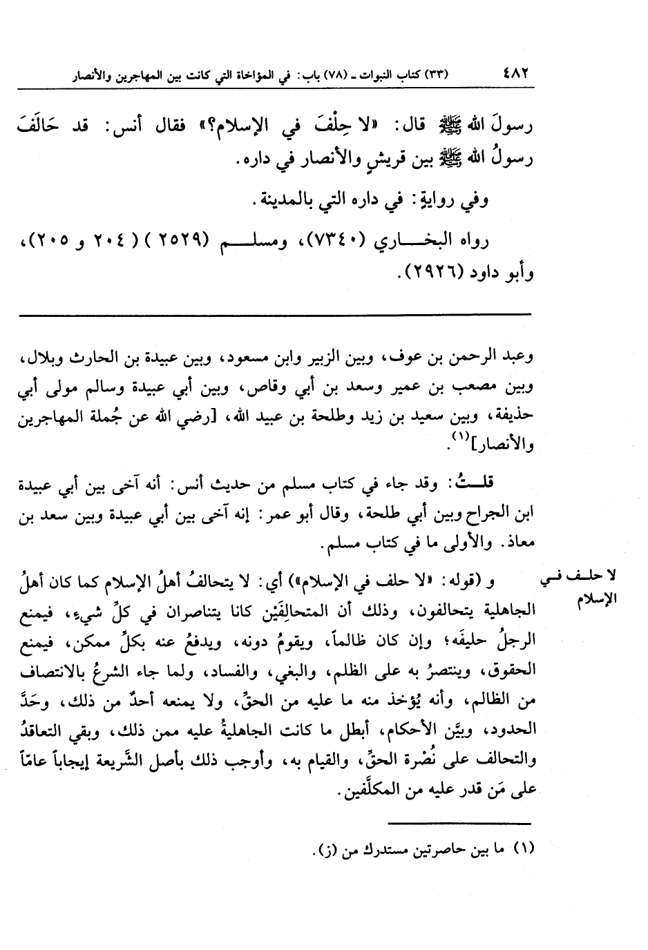 رَسُولَ اللَّهِ صَلَّى اللَّهُ عَلَيهِ وَسَلَّمَ قَالَ: لَا حِلفَ فِي الإِسلَامِ؟ فَقَالَ أَنَسٌ: قَد حَالَفَ رَسُولُ اللَّهِ صَلَّى اللَّهُ عَلَيهِ وَسَلَّمَ بَينَ قُرَيشٍ، وَالأَنصَارِ فِي دَارِهِ.