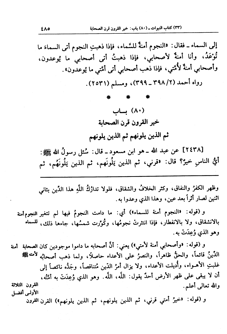 [2438] عن عبد الله - هو ابن مسعود - قَالَ: سُئِلَ رَسُولُ اللَّهِ صَلَّى اللَّهُ عَلَيهِ وَسَلَّمَ أَيُّ النَّاسِ خَيرٌ؟ قَالَ: قَرنِي ثُمَّ الَّذِينَ يَلُونَهُم ثُمَّ الَّذِينَ يَلُونَهُم، ثُمَّ