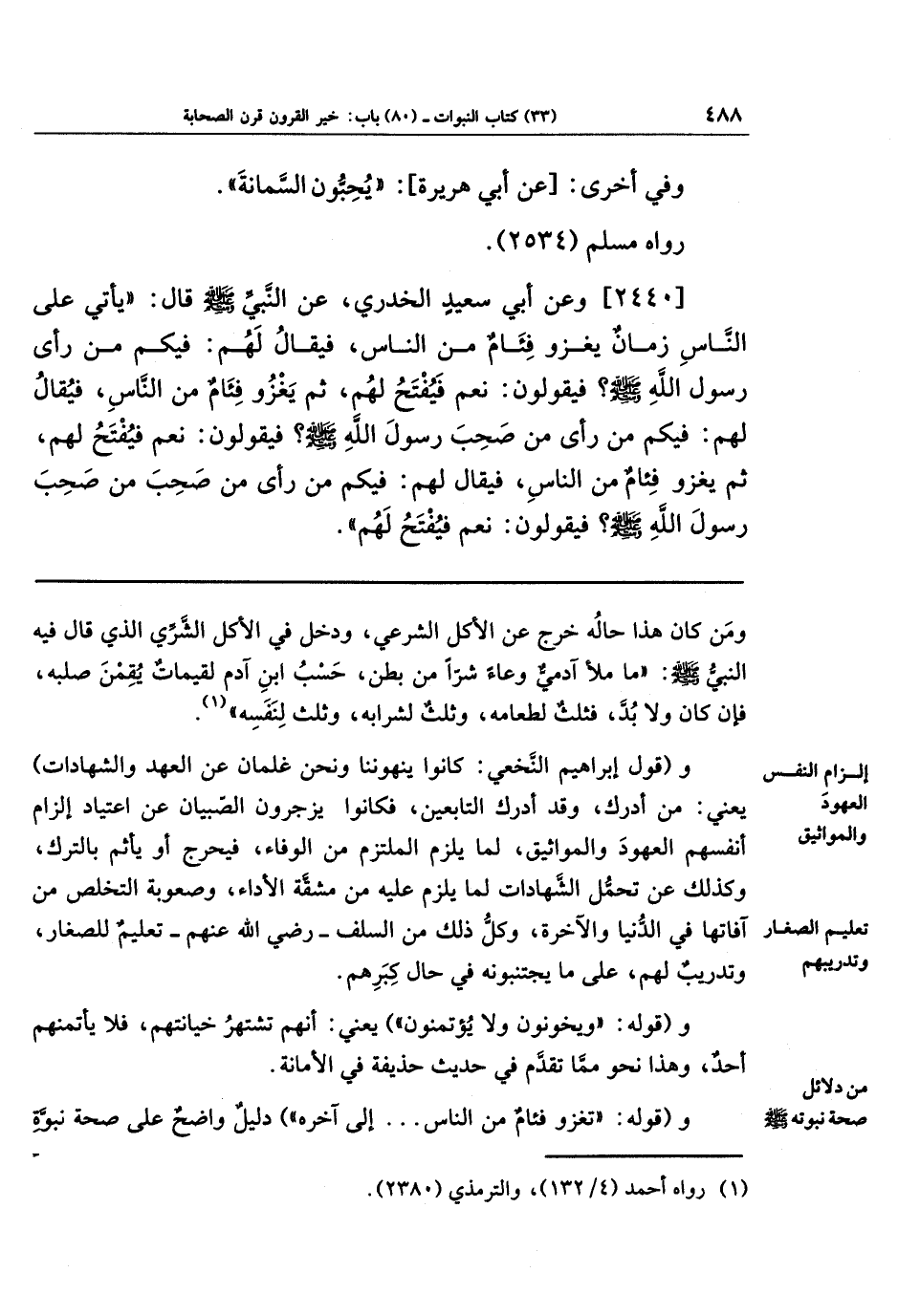 [2440] وعَن أَبِي سَعِيدٍ الخُدرِيِّ عَن النَّبِيِّ صَلَّى اللَّهُ عَلَيهِ وَسَلَّمَ قَالَ: يَأتِي عَلَى النَّاسِ زَمَانٌ يَغزُو فِئَامٌ مِن النَّاسِ فَيُقَالُ لَهُم: فِيكُم مَن رَأَى رَسُولَ اللَّهِ صَلَّى اللَّهُ عَلَيهِ وَسَلَّمَ؟ فَيَقُولُونَ: نَعَم فَيُفتَحُ لَهُم، ثُمَّ يَغزُو فِئَامٌ مِن النَّاسِ فَيُقَالُ لَهُم: فِيكُم مَن رَأَى مَن صَحِبَ رَسُولَ اللَّهِ صَلَّى اللَّهُ عَلَيهِ وَسَلَّمَ؟ فَيَقُولُونَ: نَعَم فَيُفتَحُ لَهُم: ثُمَّ يَغزُو فِئَامٌ مِن النَّاسِ فَيُقَالُ لَهُم: فِيكُم مَن رَأَى مَن صَحِبَ مَن صَحِبَ رَسُولَ اللَّهِ صَلَّى اللَّهُ عَلَيهِ وَسَلَّمَ؟ فَيَقُولُونَ: نَعَم فَيُفتَحُ لَهُم.