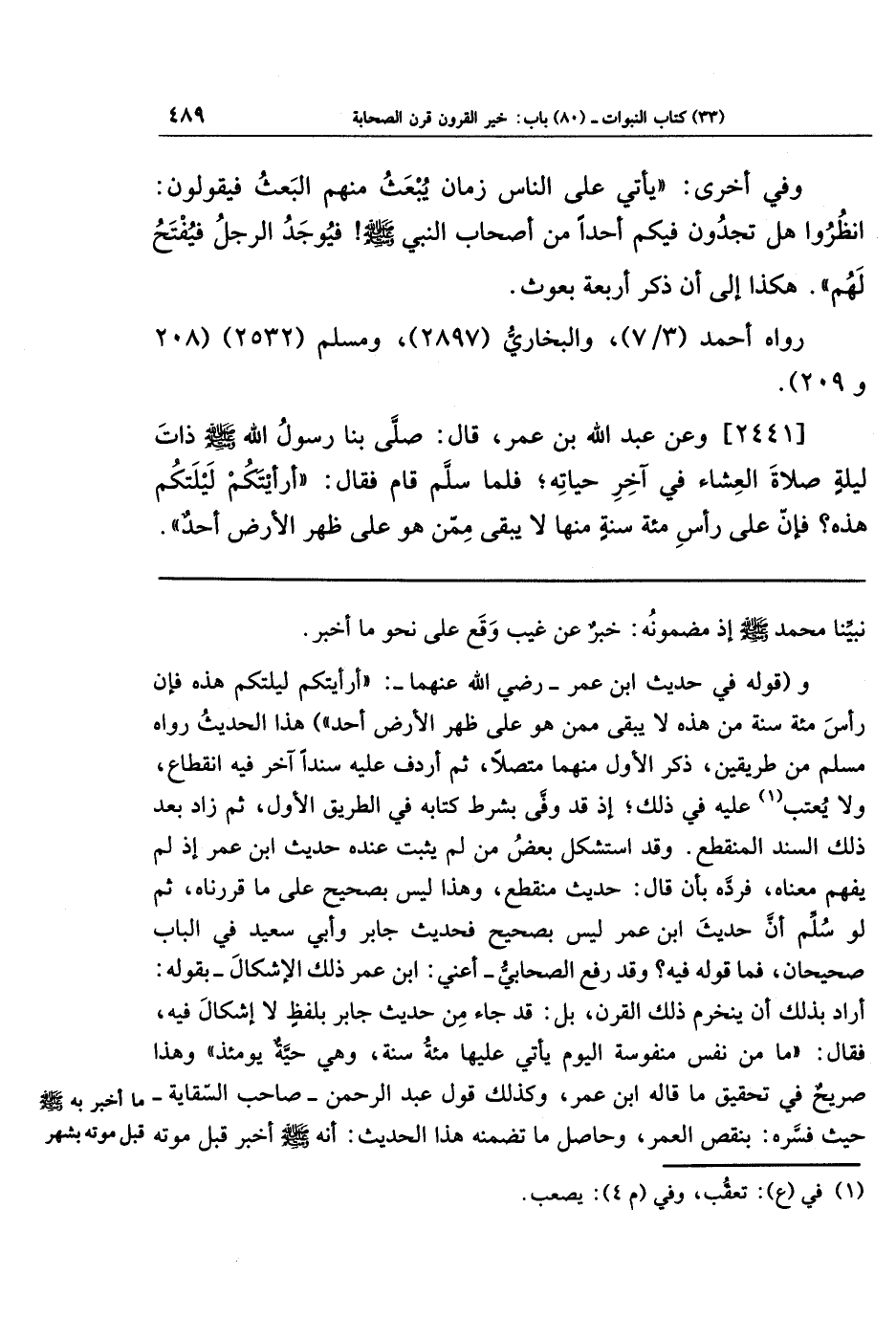 [2441] وعن عَبدَ اللَّهِ بنَ عُمَرَ قَالَ: صَلَّى بِنَا رَسُولُ اللَّهِ صَلَّى اللَّهُ عَلَيهِ وَسَلَّمَ ذَاتَ لَيلَةٍ صَلَاةَ العِشَاءِ فِي آخِرِ حَيَاتِهِ، فَلَمَّا سَلَّمَ قَامَ فَقَالَ: أَرَأَيتَكُم لَيلَتَكُم هَذِهِ؟ فَإِنَّ عَلَى رَأسِ مِائَةِ سَنَةٍ مِنهَا لَا يَبقَى مِمَّن هُوَ عَلَى ظَهرِ الأَرضِ أَحَدٌ.