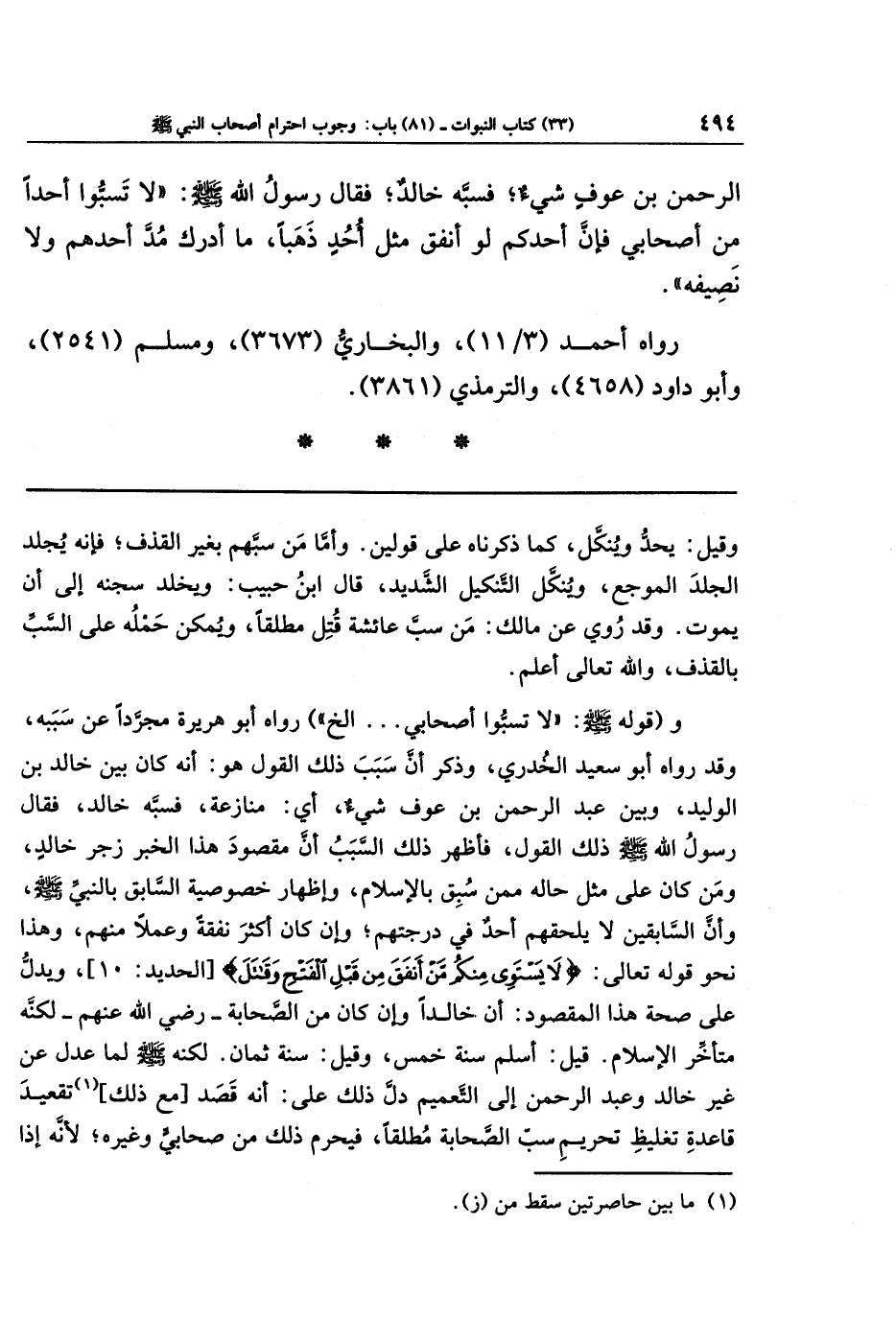 و(قوله ـ صلى الله عليه وسلم ـ: لا تسبُّوا أصحابي. . . إلخ. رواه أبو هريرة مجردًا عن سببه، وقد رواه أبو سعيد الخدري، وذكر أن سبب ذلك القول هو أنه كان بين خالد بن الوليد وبين عبد الرحمن بن عوف شيء، أي: منازعة، فسبَّه خالد، فقال رسول الله ـ صلى الله عليه وسلم ـ ذلك القول، فأظهر ذلك السبب أن مقصود هذا الخبر زجر خالد، ومن كان على مثل حاله ممن سبق بالإسلام، وإظهار خصوصية السابق بالنبي ـ صلى الله عليه وسلم ـ، وأن السابقين لا يلحقهم أحد في درجتهم، وإن كان أكثر نفقة وعملا منهم، وهذا نحو قوله تعالى: {لا يَستَوِي مِنكُم مَن أَنفَقَ مِن قَبلِ الفَتحِ وَقَاتَلَ} ويدل على صحة هذا المقصود: أن خالدًا وإن كان من الصحابة - رضي الله عنهم، لكنَّه متأخر الإسلام. قيل: أسلم سنة خمس، وقيل: سنة ثمان. لكنه ـ صلى الله عليه وسلم ـ لما عدل عن غير خالد وعبد الرحمن إلى التعميم دلَّ ذلك على أنه قصد [مع ذلك] (¬1) تقعيد قاعدة تغليظ تحريم سب الصحابة مطلقًا، فيحرم ذلك من صحابي وغيره، لأنَّه إذا
