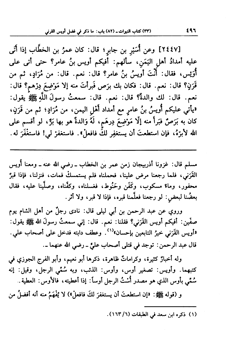 [2447] وعَن أُسَيرِ بنِ جَابِرٍ قَالَ: كَانَ عُمَرُ بنُ الخَطَّابِ إِذَا أَتَى عَلَيهِ أَمدَادُ أَهلِ اليَمَنِ، سَأَلَهُم: أَفِيكُم أُوَيسُ بنُ عَامِرٍ؟ حَتَّى أَتَى عَلَى أُوَيسٍ، فَقَالَ: أَنتَ أُوَيسُ بنُ عَامِرٍ؟ قَالَ: نَعَم. قَالَ: مِن مُرَادٍ، ثُمَّ مِن قَرَنٍ؟ قَالَ: نَعَم. قَالَ: فَكَانَ بِكَ بَرَصٌ فَبَرَأتَ مِنهُ إِلَّا مَوضِعَ دِرهَمٍ؟ قَالَ: نَعَم. قَالَ: لَكَ وَالِدَةٌ؟ قَالَ: نَعَم. قَالَ: سَمِعتُ رَسُولَ اللَّهِ صَلَّى اللَّهُ عَلَيهِ وَسَلَّمَ يَقُولُ: يَأتِي عَلَيكُم أُوَيسُ بنُ عَامِرٍ مَعَ أَمدَادِ أَهلِ اليَمَنِ مِن مُرَادٍ، ثُمَّ مِن قَرَنٍ، كَانَ بِهِ بَرَصٌ فَبَرَأَ مِنهُ إِلَّا مَوضِعَ دِرهَمٍ، لَهُ وَالِدَةٌ هُوَ بِهَا بَرٌّ، لَو أَقسَمَ عَلَى اللَّهِ لَأَبَرَّهُ، فَإِن استَطَعتَ أَن يَستَغفِرَ لَكَ فَافعَل. فَاستَغفِر لِي، فَاستَغفَرَ لَهُ،